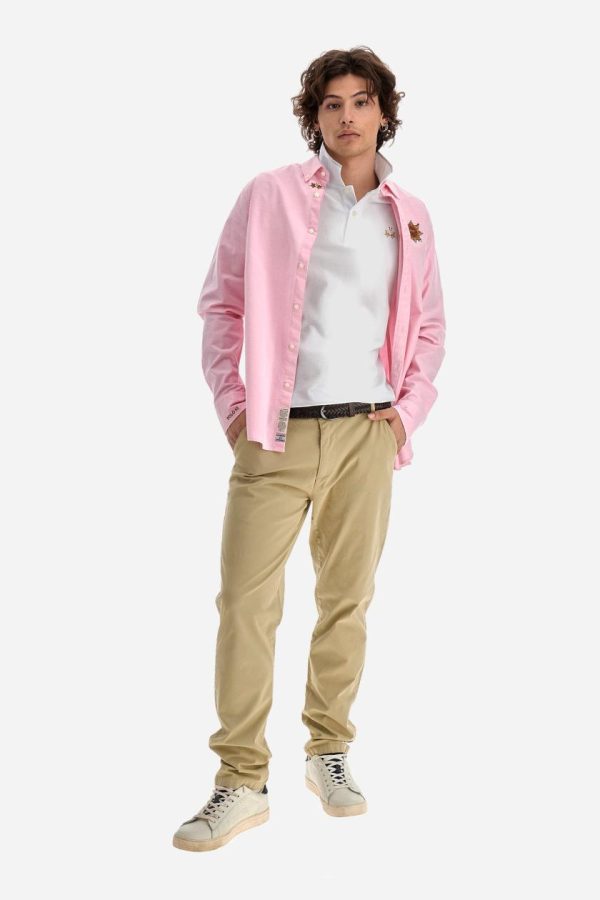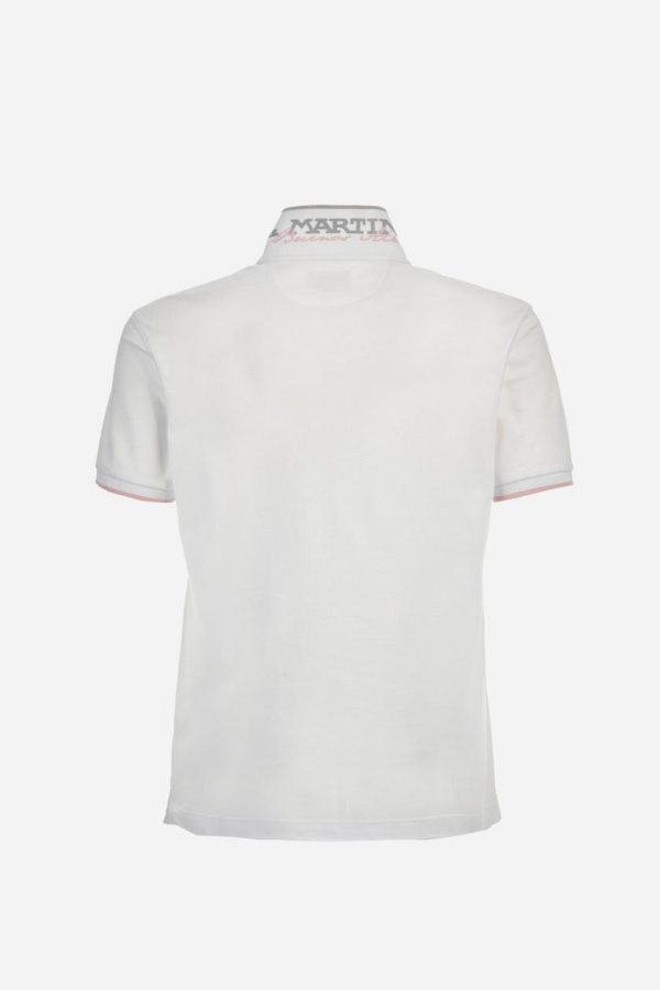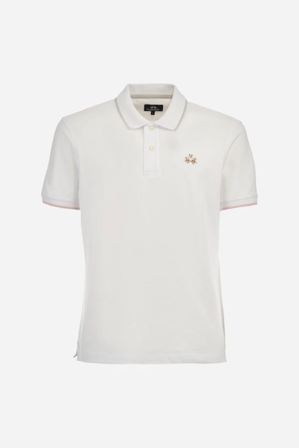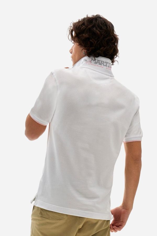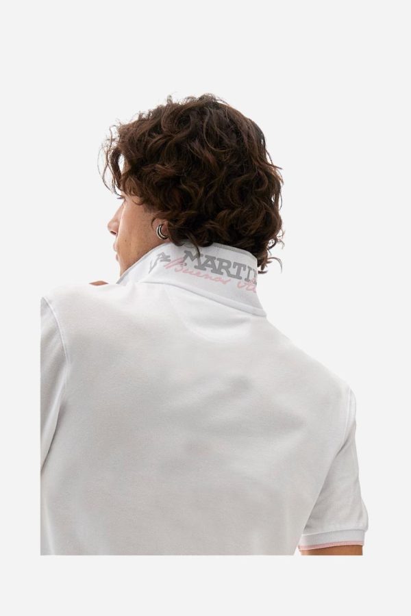 Short-sleeved, single-colour men’s polo shirt made of stretch cotton piqué. Fastens with two buttons. The collar and cuffs are ribbed, and there is a colour-contrasting trim at the bottom of the collar. Inside the collar there is a grosgrain ribbon of a different shade. The logo is embroidered on the chest in a contrasting colour. The fit is slim. The model is wearing a size L.