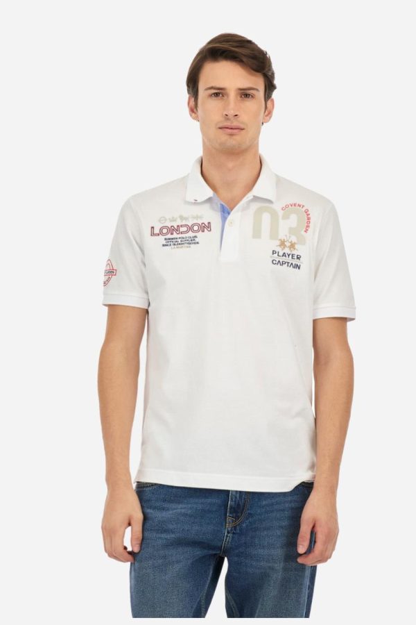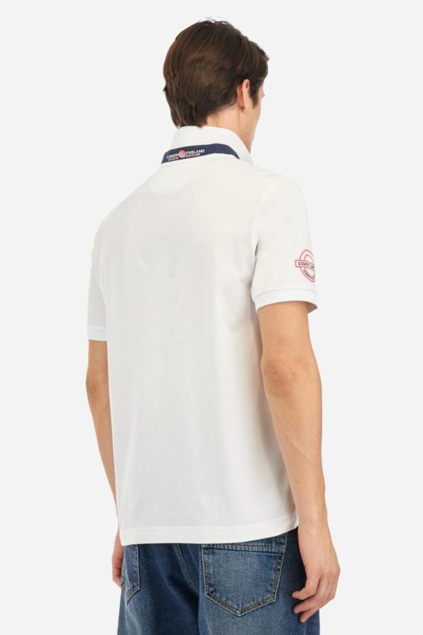 Short-sleeved, single-colour men’s polo shirt made of stretch cotton piqué. Two-button fastening, with interior in contrasting fabric and colour. Inner collar with contrasting grosgrain ribbon as a motif. The collar and cuffs are in tone-on-tone ribbed knit. A contrasting fabric stay with embroidery is inserted under the collar. The emblem on the sleeve is embroidered, while on the chest, the graphics alternate between embroidery and prints in various colours. The logo is embroidered on the chest, left side. The fit is regular. The model is wearing a size L.