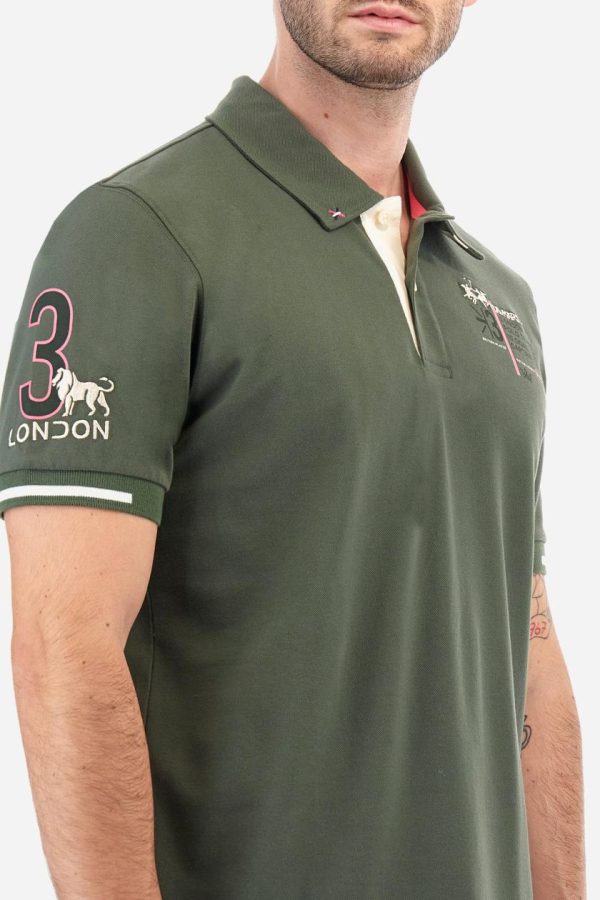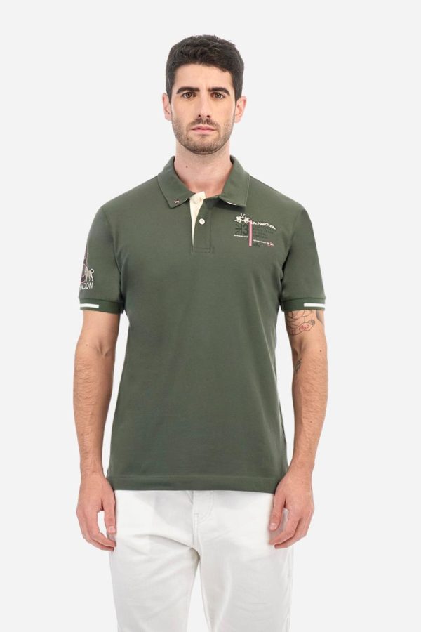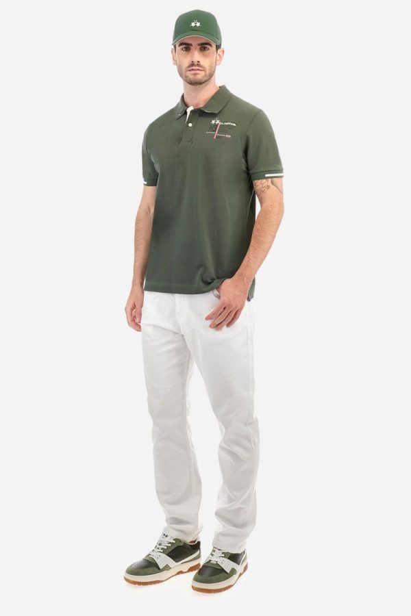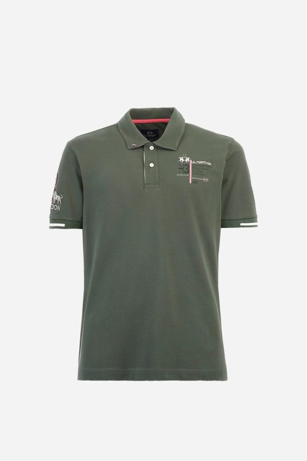 Short-sleeved, single-colour men’s polo shirt made of stretch cotton piqué. Fastens with two buttons and internal opening, button side, in contrasting fabric. Ribbed collar and cuffs. The cuffs feature an inlaid detail in a contrasting colour. The graphics on the chest and back are made with mixed techniques: printing and embroidery. The logo is embroidered on the chest, left side. The fit is regular. The model is wearing a size L.