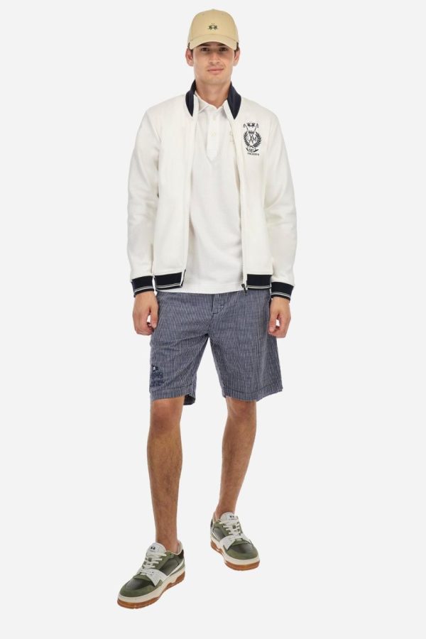 - Embroidery on the left side of the chest, in contrasting thread, inspired by the French Riviera