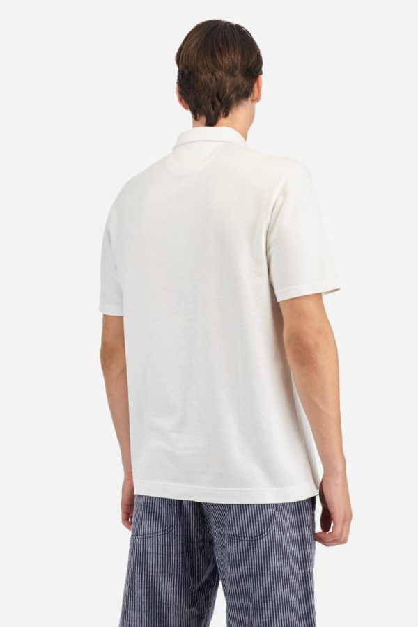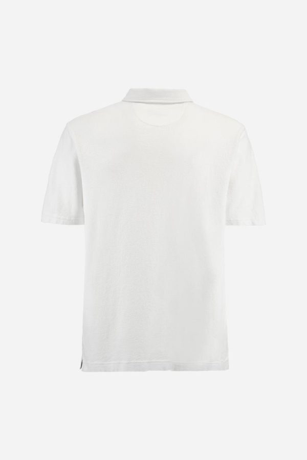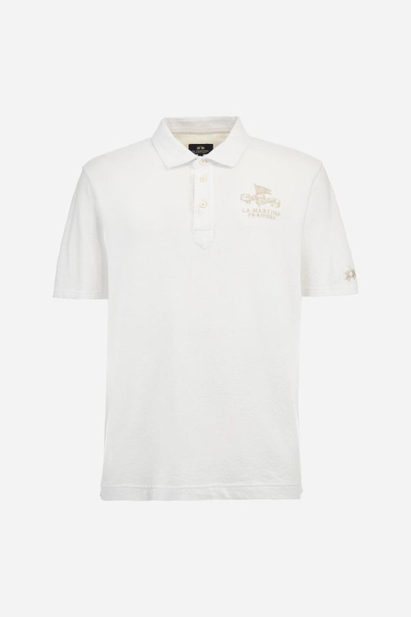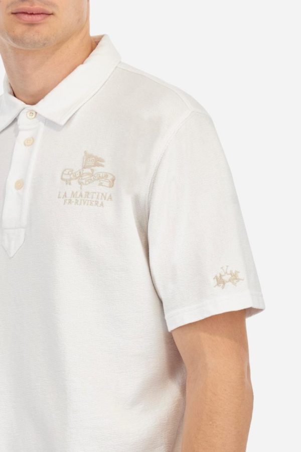 Men’s plain short-sleeved polo shirt made from brushed jersey. Three-button fastening. The embroidery on the left side of the chest, in contrasting thread, is inspired by the French Riviera. A small logo is embroidered on the left sleeve, also using contrasting thread. Regular fit. The model is wearing a size L.
