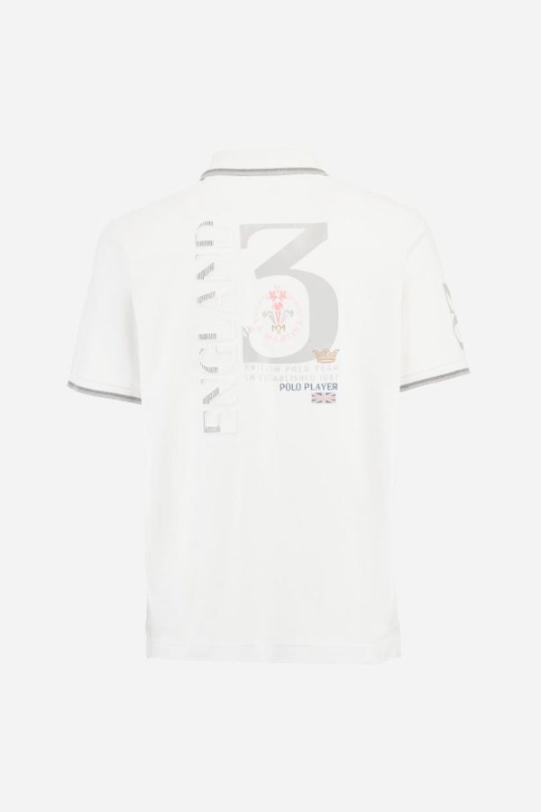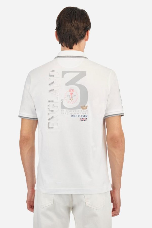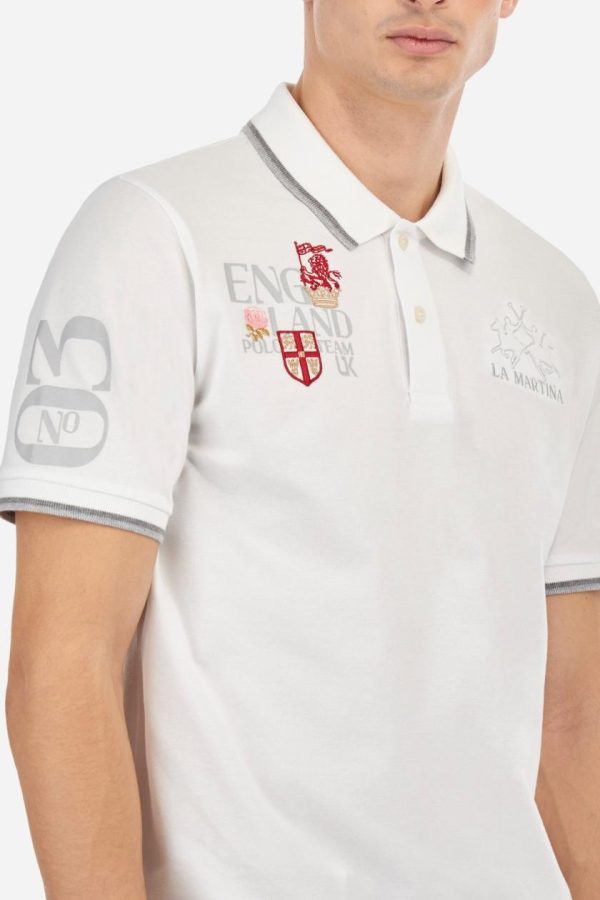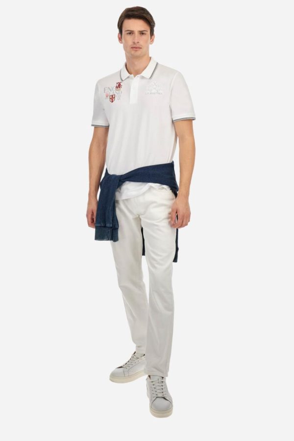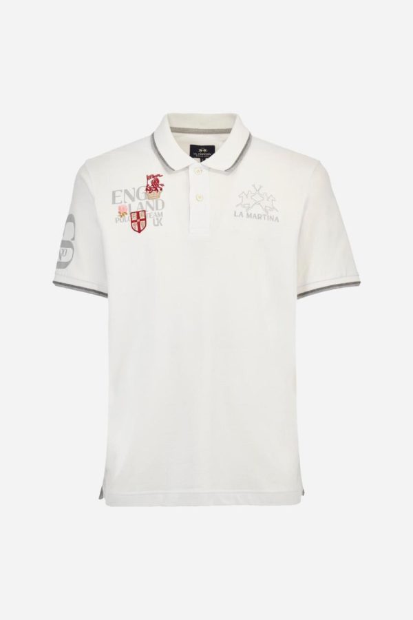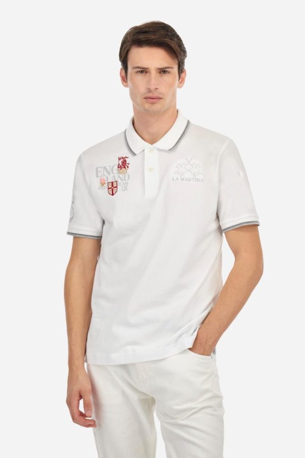 Men’s solid color polo shirt, made of slightly elasticated cotton piqué. Two-button closure. Ribbed collar and sleeve hems, with a contrasting two-tone detail at the bottom of the sleeves. The entire garment features details crafted using mixed techniques. Both the front and back display embroidery and prints. The logo and the La Martina lettering are embroidered on the left chest. The fit is regular. The model is wearing size L.