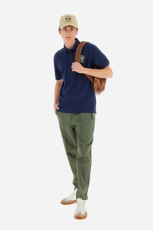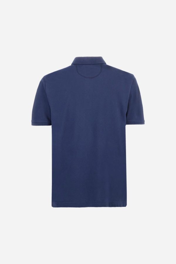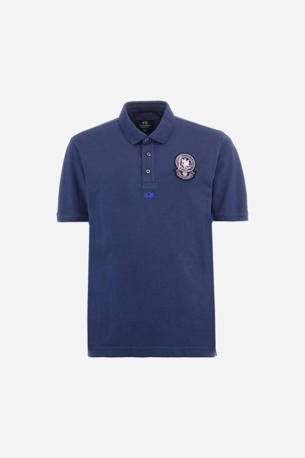 Men’s short-sleeved polo shirt in a single colour, made of cotton stretch pique. Fastens with three buttons. Cuffs and collar in rib knit to match the garment. Patch in metallic thread applied on the chest. A colour-contrasting logo is present on the front. Regular fit. The model is wearing a size L.
