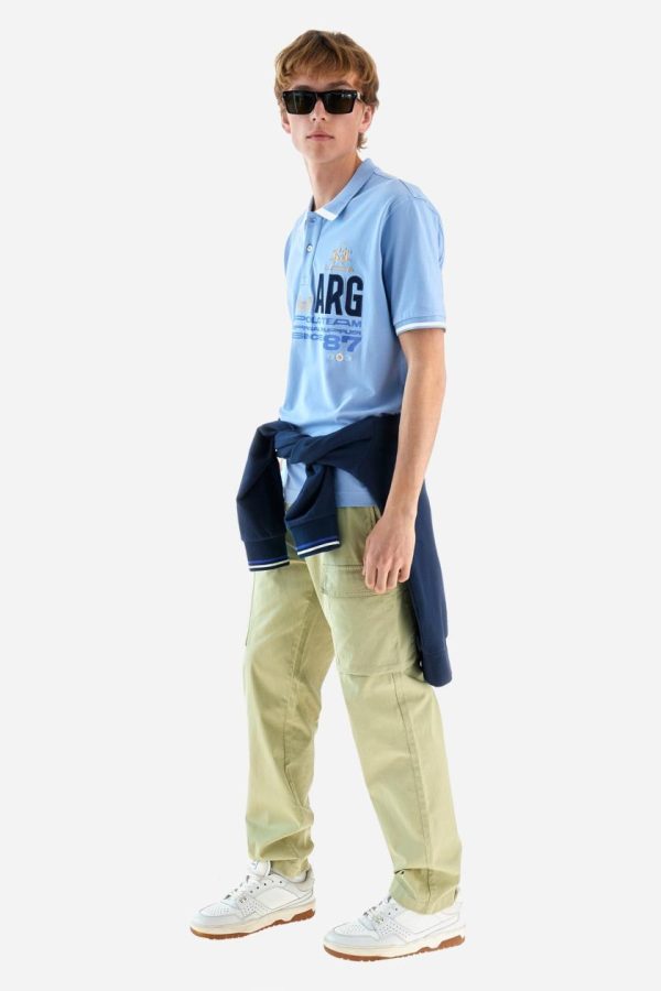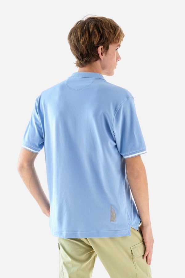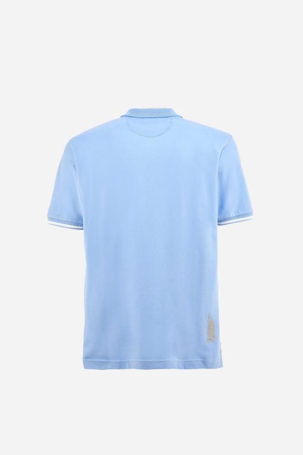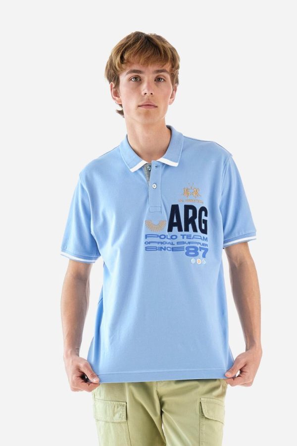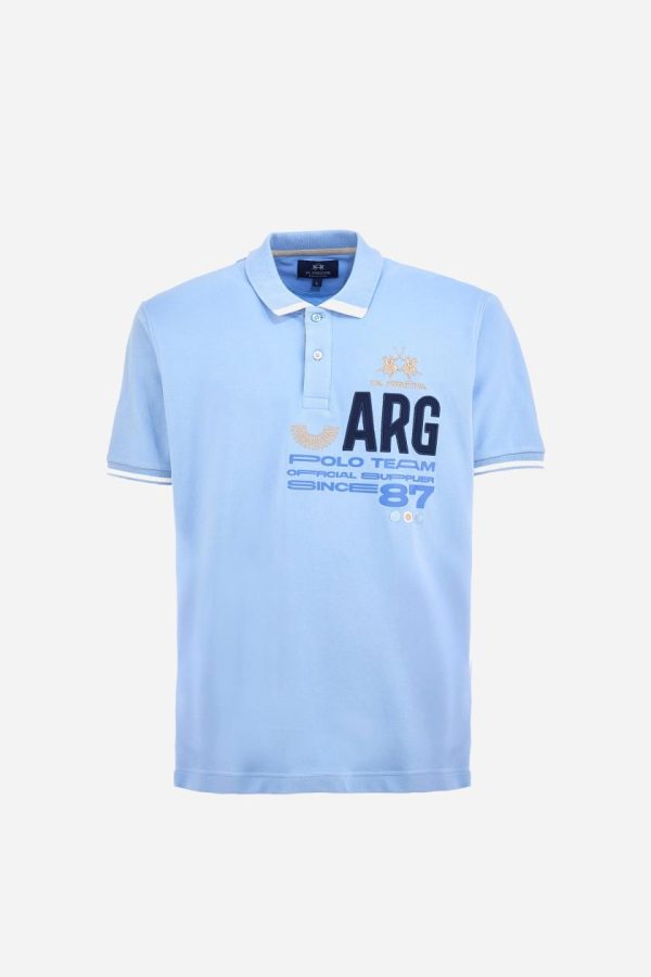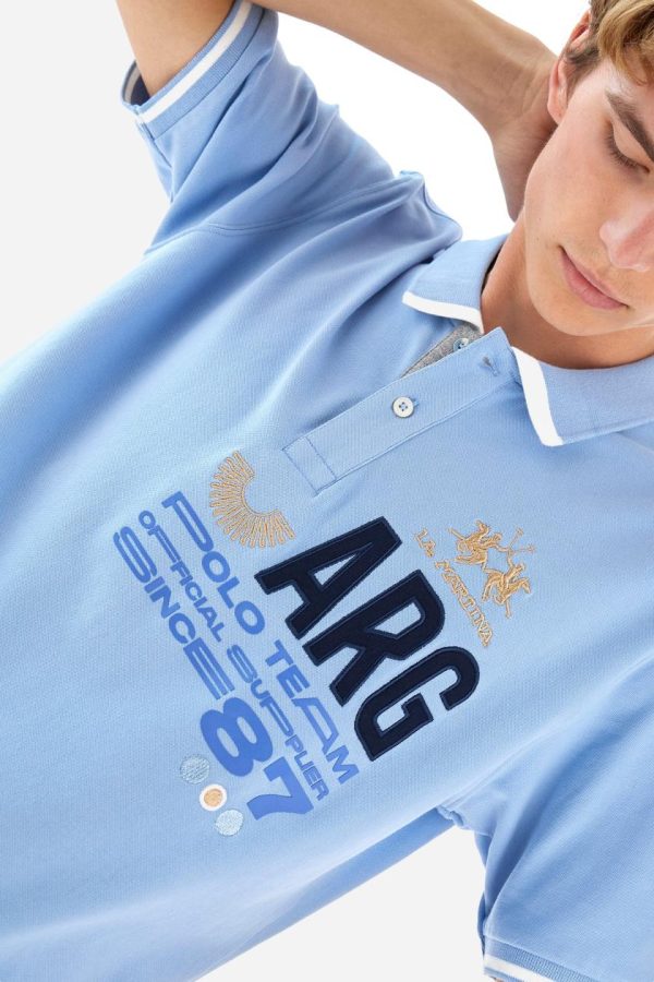 Men’s plain short-sleeved polo shirt made from stretch piqué. Two button fastening, the first of which has the Argentine flag printed on it. The collar and cuffs are in two-tone ribbed knit with contrasting piping. The inside of the button opening is in the same fabric but in a different colour to the body. The chest graphic is positioned on the left side of the garment. A stylised half sun, present on the Argentine flag, is embroidered under the opening, while the writing is a multicoloured semi-gloss print. Only the logo and the dots under the writing are embroidered with contrasting coloured threads. On the bottom of the reverse, towards the side, there is a gold-coloured rubberised transfer, celebrating the future World Cups in Dubai. Regular fit. The model is wearing a size L.