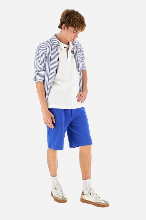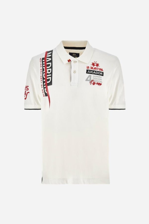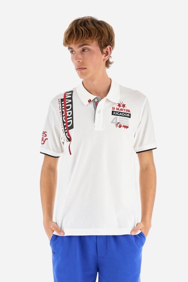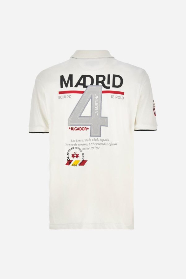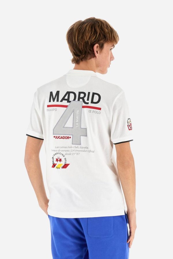 Men’s plain short-sleeved polo shirt made from stretch piqué. Two-button fastening. Ribbed collar with long hand-embroidered stitches in the colours of the Spanish flag on the right collar sail. The cuffs are also in ribbed knit with a contrasting coloured band on the bottom. A grosgrain ribbon of a different shade is applied on the inside of the collar and the inside of the opening also features the same material but in a contrasting colour with the lettering La Martina printed vertically and in contrast. On the right shoulder, on the front, the Madrid lettering in rubber print plays with multiple colours and misaligned cuts, while the left chest features multicoloured embroidery and printed lettering. On the right sleeve, the graphic above the cuff is a multicoloured embroidery dedicated to Madrid. The back is decorated with various elements, which recall those on the front, made with different techniques. The number 4 is a large patch in a matching fabric, embroidered and decorated with dots and lettering in a contrasting colour. The logo is embroidered on the left side of the chest in contrasting thread. Regular fit. The model is wearing a size L.