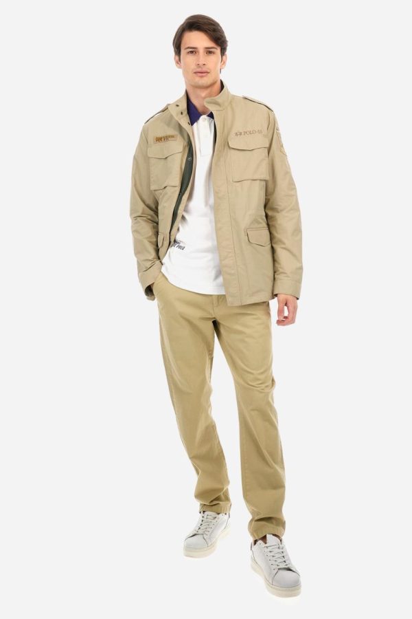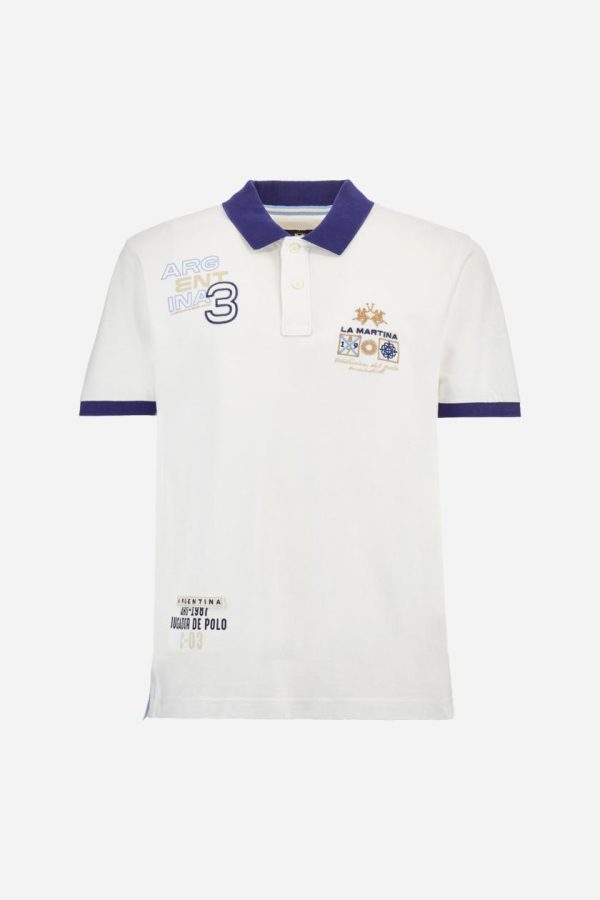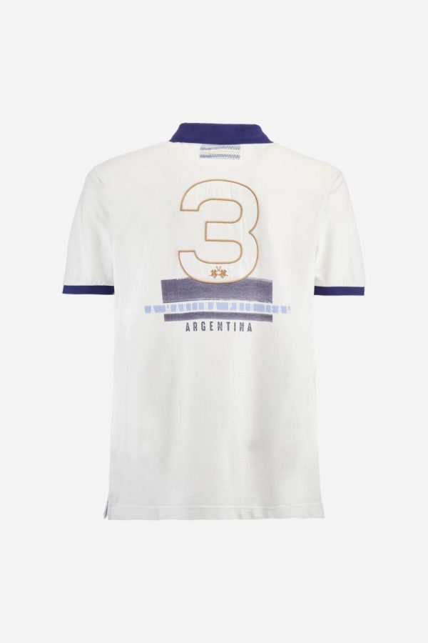 Men’s plain short-sleeved polo shirt made from cotton piqué. Two-button fastening. Ribbed collar and sleeve cuffs in contrasting colour. Inside the collar there is a two-tone grosgrain ribbon with the colours of the Argentine flag. The front features a print of the lettering Argentina with a fabric patch of the number 3 applied with a contrasting embroidered cord, while on the left side of the chest the multicoloured logo embroidery is accompanied by Argentina-inspired writing and logos. The back of the polo shirt is embellished with a large fabric patch of the number 3, applied with embroidered cord and with the small logo embroidered on the inside in a contrasting colour. Also features lettering and patches with an Argentina-inspired theme. Regular fit. The model is wearing a size L.