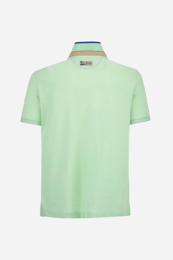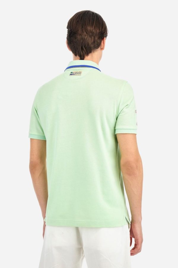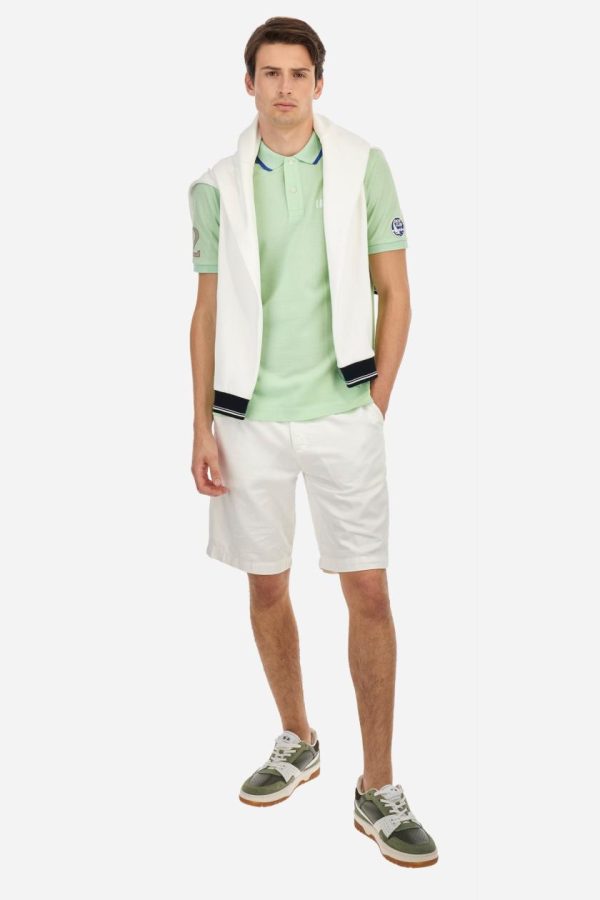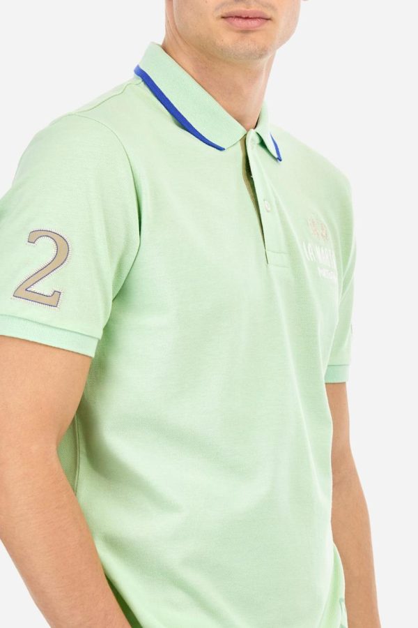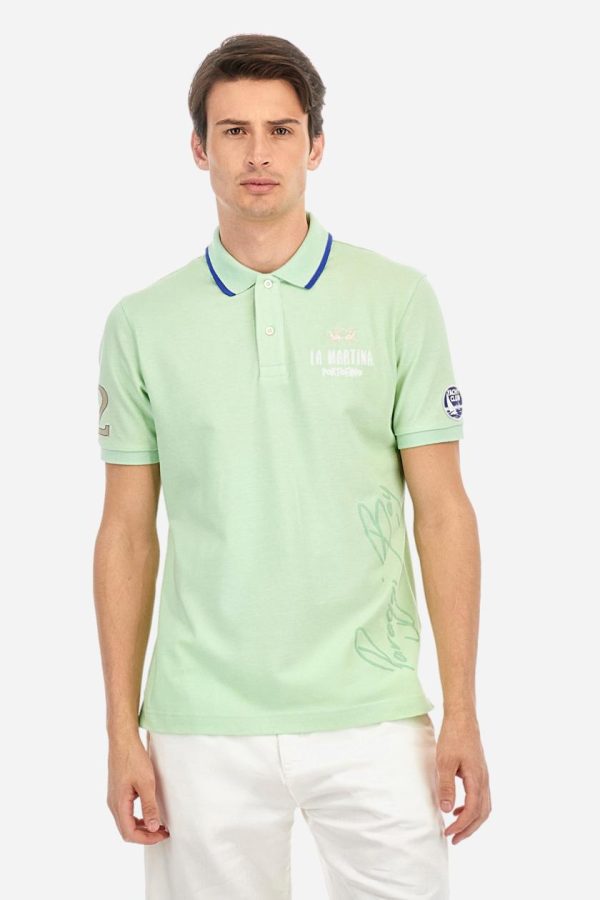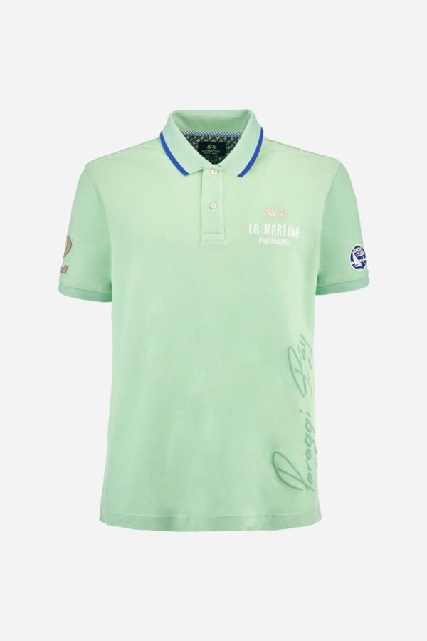 Men’s plain short-sleeved polo shirt made from cotton piqué. Two-button fastening. The collar and cuffs are made from tone-on-tone ribbed fabric. The collar features a contrasting band at the bottom, and there is a contrasting fabric panel inserted into the neckline under the collar, finished with red stitching. A two-tone striped ribbon is appliquéd around the inside of the collar, while the inside of the collar features a fabric panel with a geometric print. There are fabric patches appliquéd on both sleeves. On the left side, the large raised vertical lettering, celebrating Paraggi Bay beach, is embroidered in tone-on-tone thread. The logo is embroidered on the left side of the chest, alongside the La Martina and Portofino lettering, all in contrasting thread. Regular fit. The model is wearing a size L.