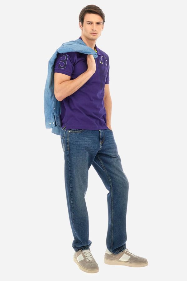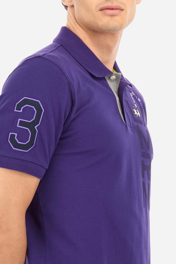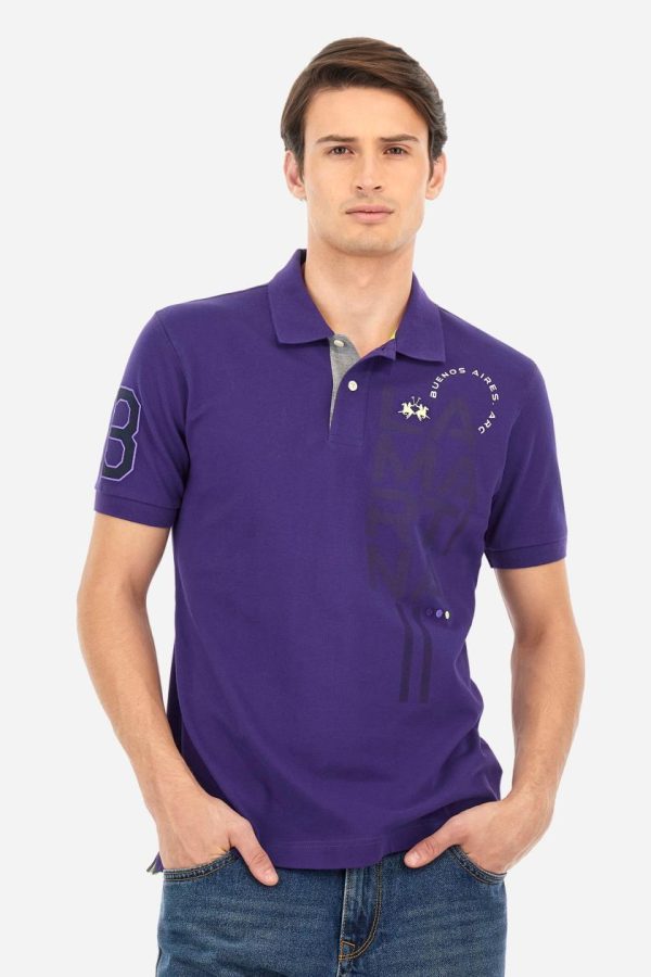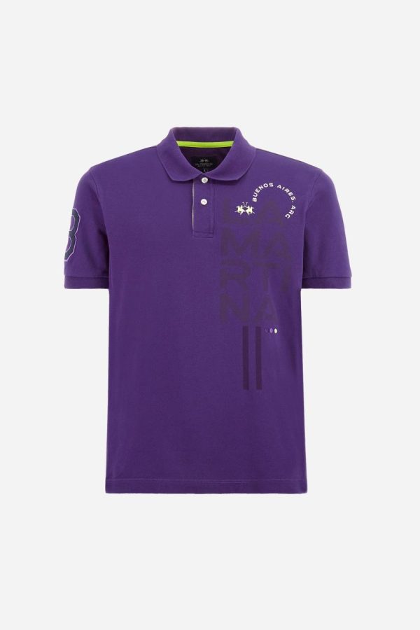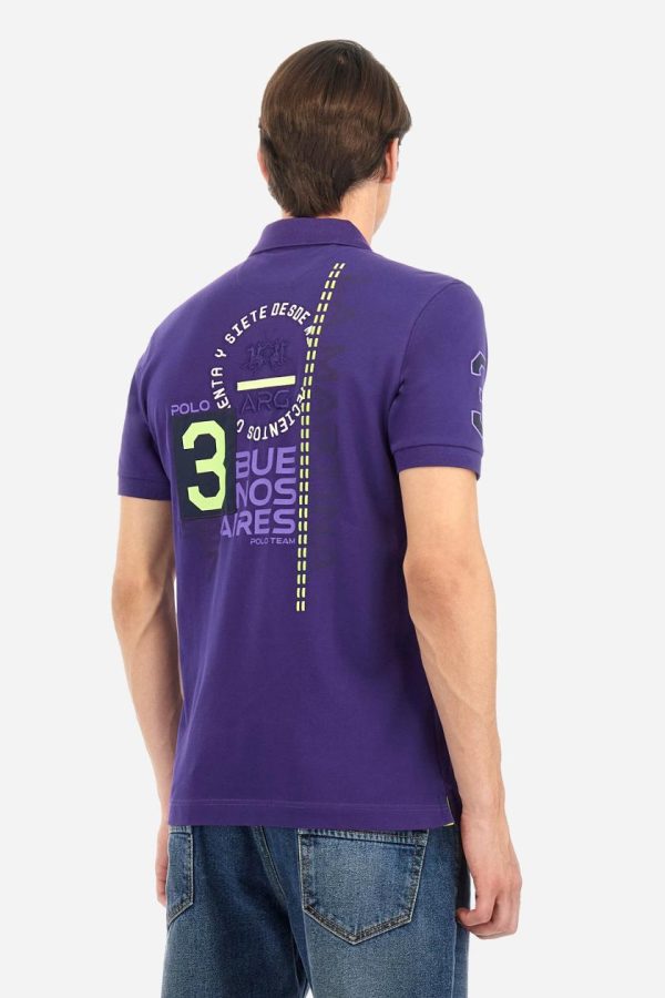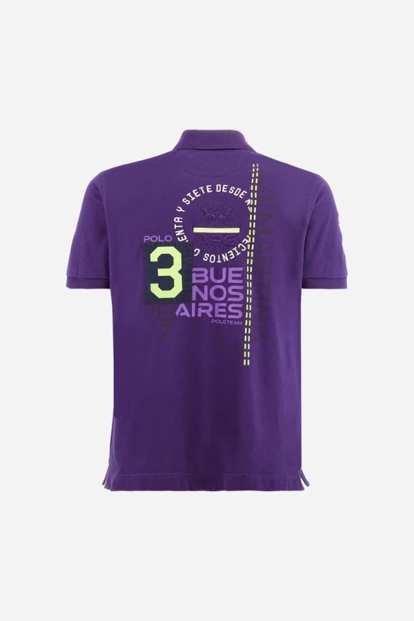 Men’s plain short-sleeved polo shirt made from stretch piqué. The design features a two-button fastening and contrasting grosgrain tape inside the collar. The collar and cuffs are made from ribbed fabric. On the front left side, the La Martina lettering appears in a tone-on-tone print, while the Buenos Aires Arg lettering and logo are embroidered in contrasting thread. A fabric patch depicting the number 3, featuring different coloured details, is appliquéd on the right sleeve. On the back, the polo shirt is embellished with many elements: multicoloured embroidered and printed lettering, as well as a large square fabric patch with a contrasting print of the number 3 appliquéd with embroidered cord. The logo is embroidered on the left side of the chest in contrasting thread. Regular fit. The model is wearing a size L.