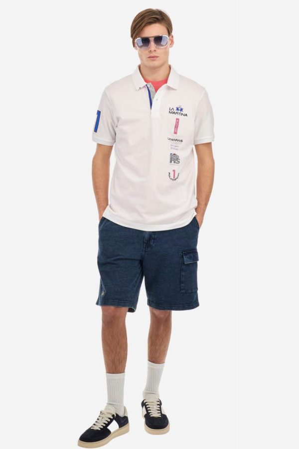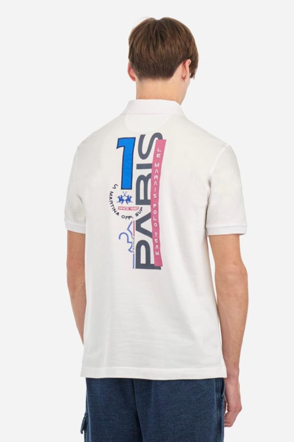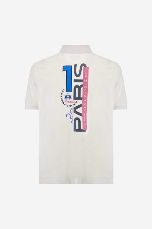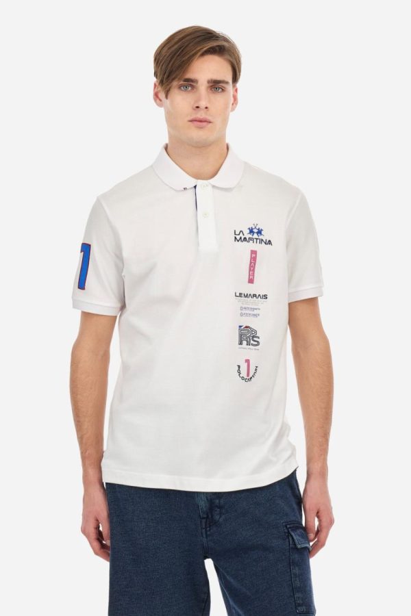 Men’s plain short-sleeved polo shirt made from stretch piqué. The design features a two-button fastening and two-tone grosgrain tape inside the collar. The collar and cuffs are made from ribbed fabric. The inside of the placket is also made from piqué, but in a different colour, and embellished with a small band in another colour. The graphic on the left side of the chest is a combination of transfers and embroidered lettering and numbers, which are all references to the Paris games. On the right sleeve, there is a number 1 patch in a different colour, appliquéd with an embroidered cord. On the back, the large printed vertical lettering is accompanied by a fabric patch of the number 1 appliquéd with embroidered cord, as well as other multicoloured embroidered lettering and logos. There is a contrasting logo embroidered on the left side of the chest. Regular fit. The model is wearing a size L.