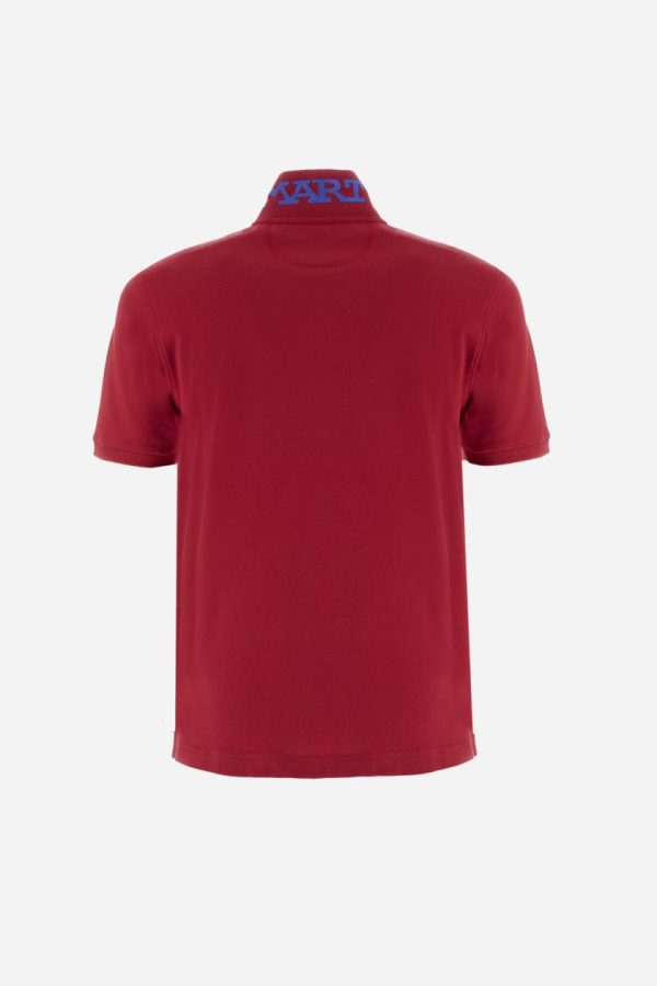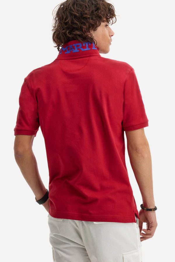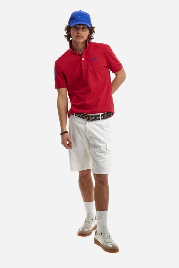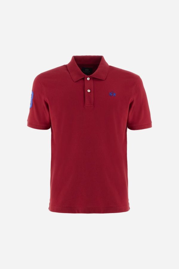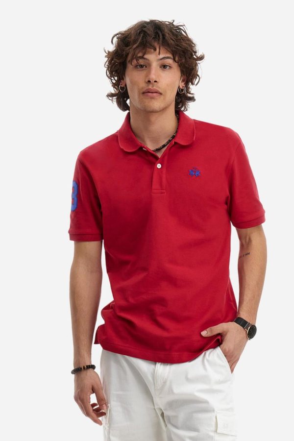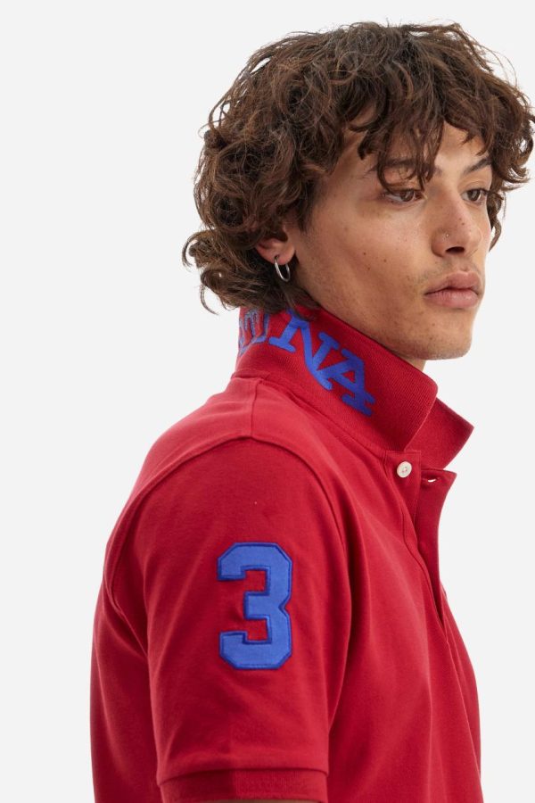 Men’s plain short-sleeved polo shirt made from stretch piqué. Two-button fastening. The collar and cuffs are made from tone-on-tone ribbed fabric. A contrasting fabric patch depicting the number 3 is appliquéd on the right sleeve. The logo is embroidered on the left side of the chest in contrasting thread. Under the collar, there is a large contrasting print of the La Martina lettering. Regular fit. The model is wearing a size L.