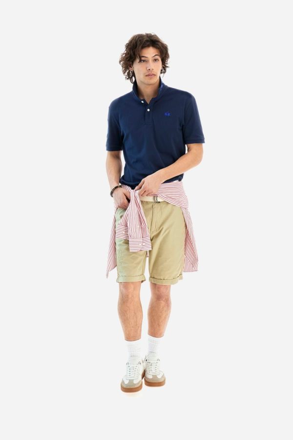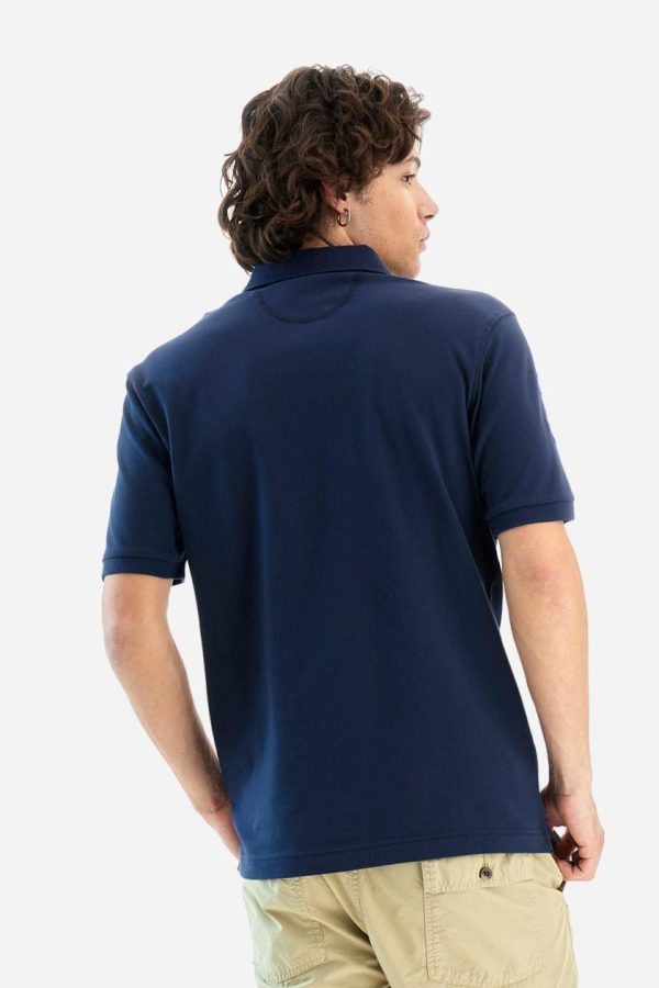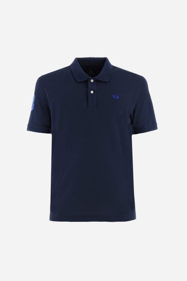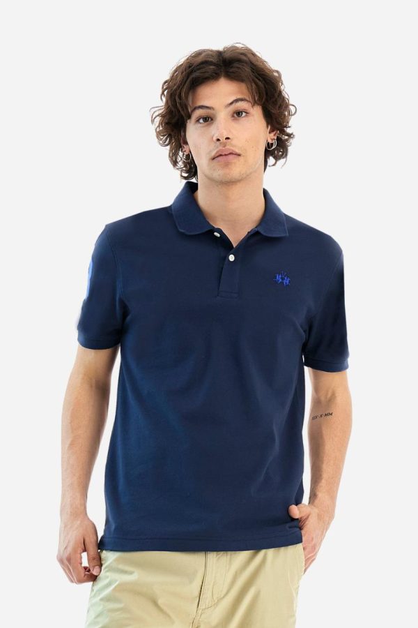 Men’s plain short-sleeved polo shirt made from stretch piqué. Two-button fastening. The collar and cuffs are made from tone-on-tone ribbed fabric. A contrasting fabric patch depicting the number 3 is appliquéd on the right sleeve. The logo is embroidered on the left side of the chest in contrasting thread. Under the collar, there is a large contrasting print of the La Martina lettering. Regular fit. The model is wearing a size L.