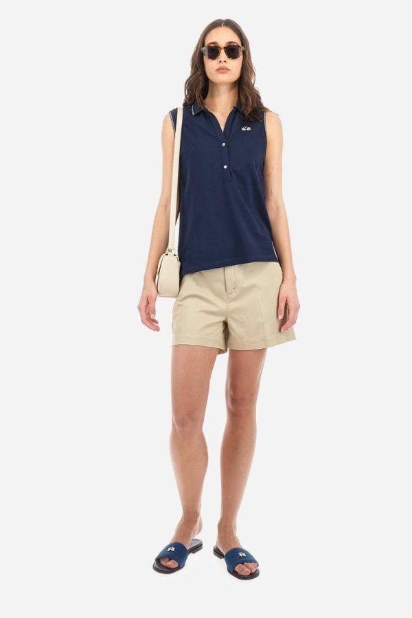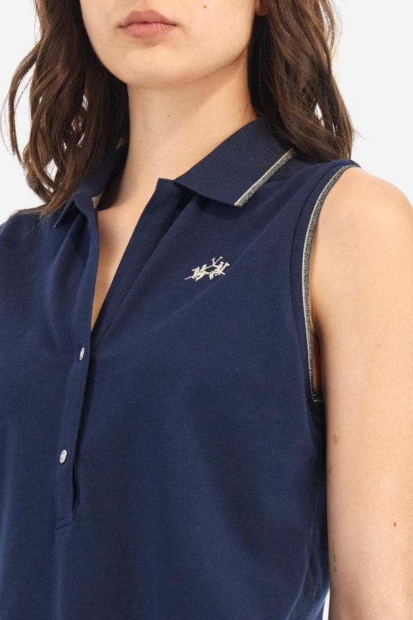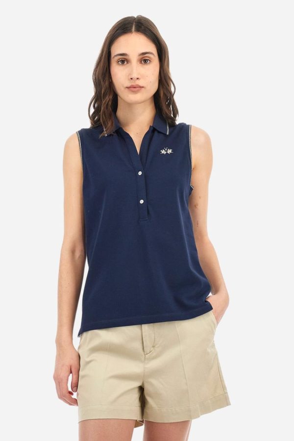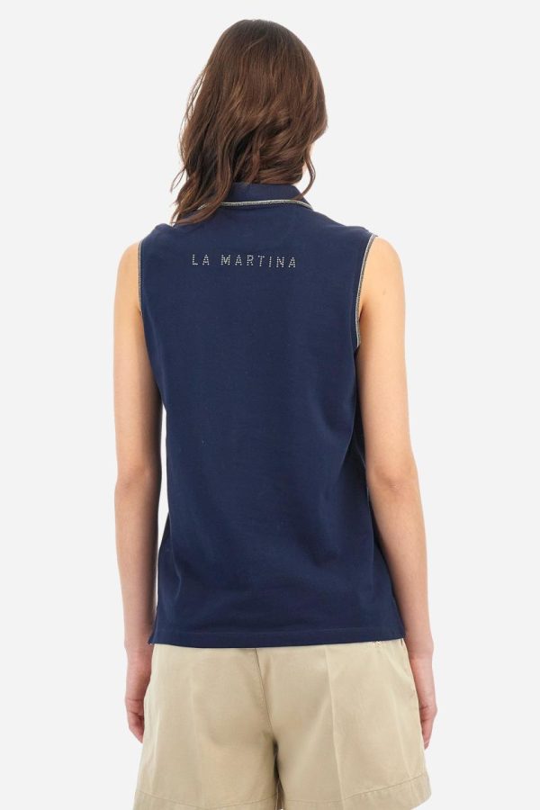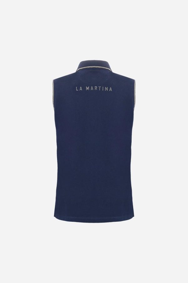 Women’s sleeveless polo shirt in a single colour, made of stretch pique. Deep V-neck. Fastens with two buttons. The collar and armhole cuffs are in a matching ribbed fabric, trimmed at the bottom with a contrasting coloured lurex band. The inside of the neck features a silver lurex grosgrain ribbon. The back features the lettering La Martina made with small applied rhinestones. The logo is embroidered on the chest, left side, with silver lurex thread. Regular fit. The model is wearing a size 2.