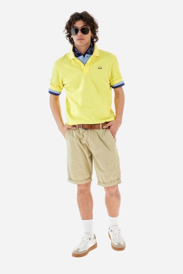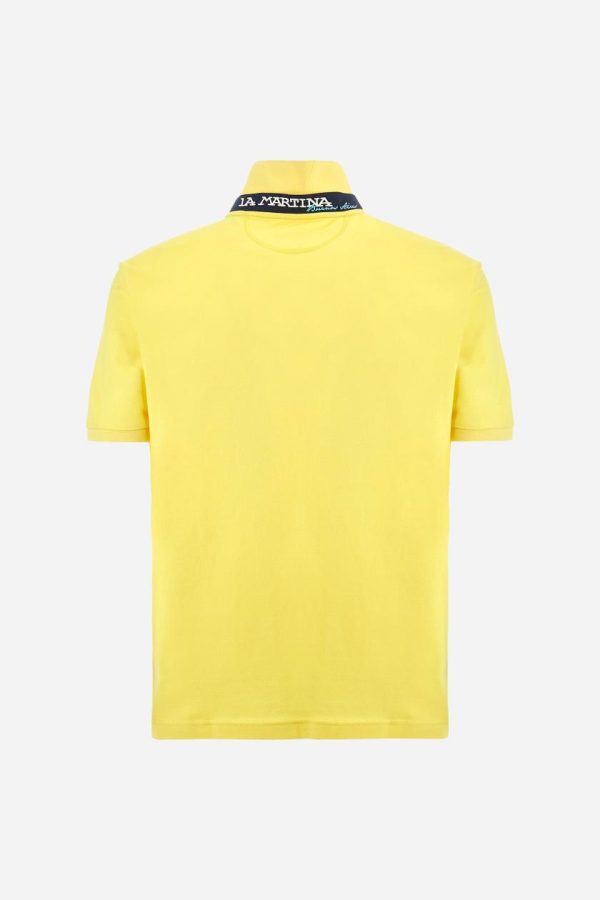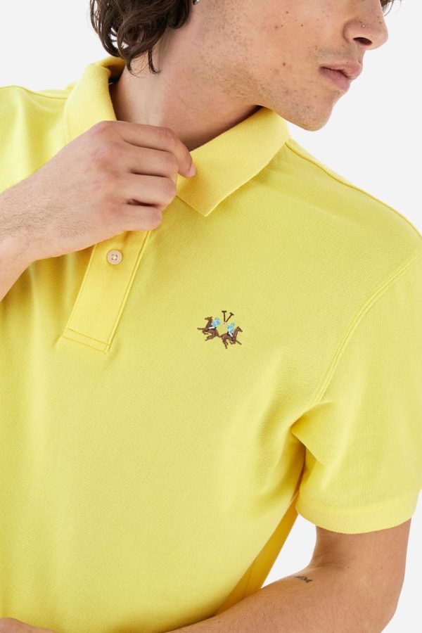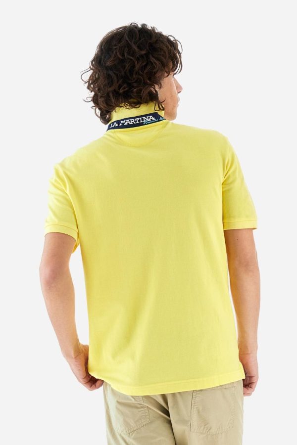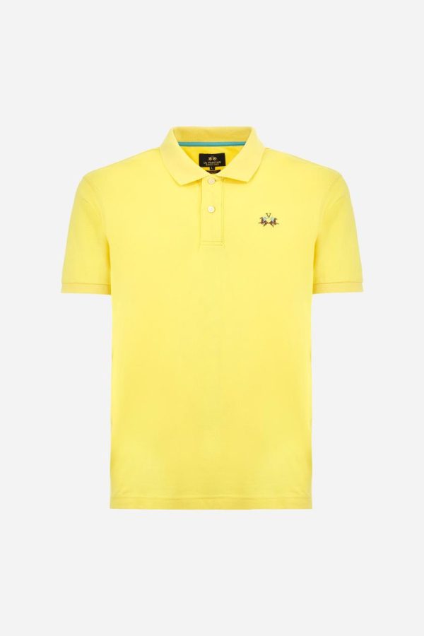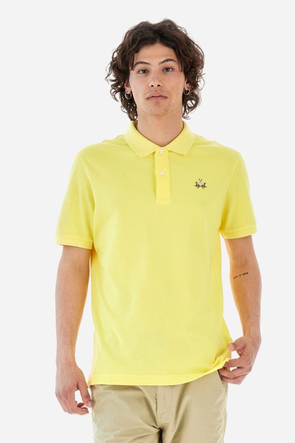 Men’s plain short-sleeved polo shirt made from stretch piqué. Two-button fastening. The collar and cuffs are made from tone-on-tone ribbed fabric. Under the collar, there is a contrasting fabric panel with embroidered multicoloured lettering. The logo is embroidered on the left side of the chest in contrasting thread. Slim fit. The model is wearing a size L.