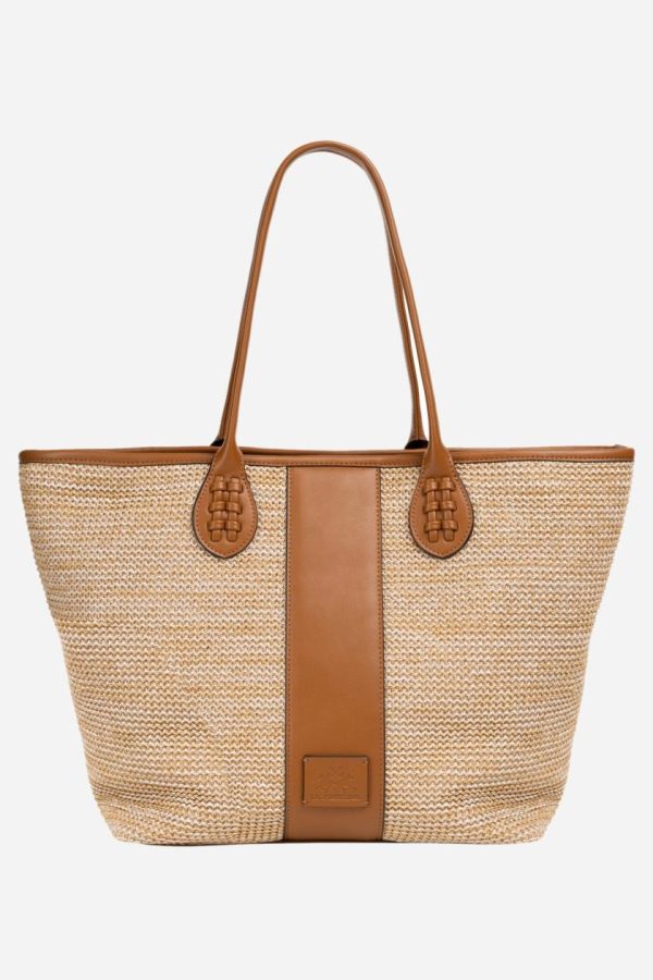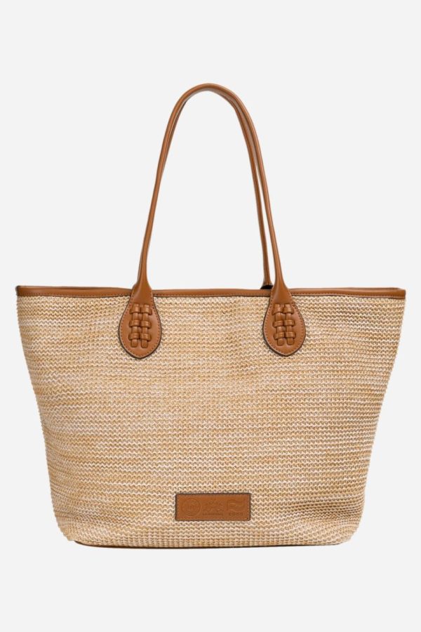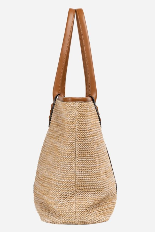 Elevate your style with this beautifully crafted two-tone women’s shoulder bag, made of premium raffia with durable polyurethane details. The accessory features an eye-catching zigzag texture that adds depth and sophistication. Inside the lining is made of polyester and cotton for lasting quality. Inside there is a convenient removable pocket with a zip fastening for secure storage. The iconic logo is prominently branded on a patch on the front. Dimensions (length x height x width) 48 x 30 x 15 cm.