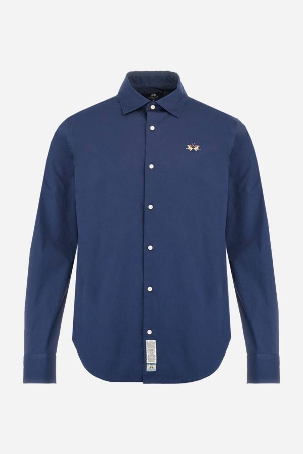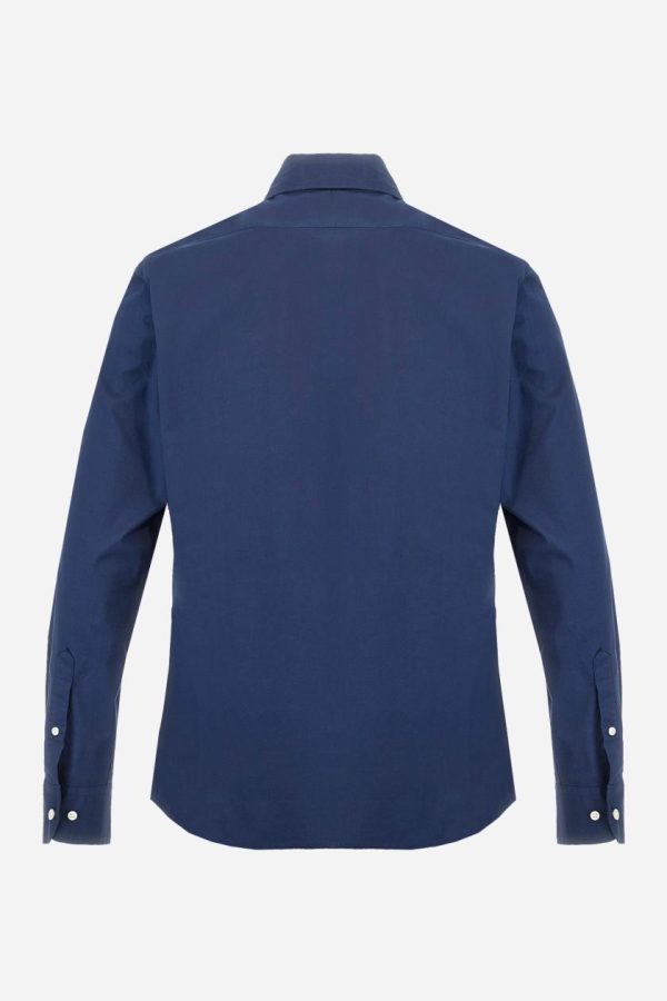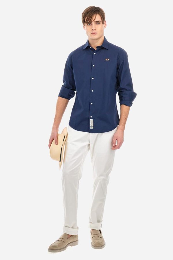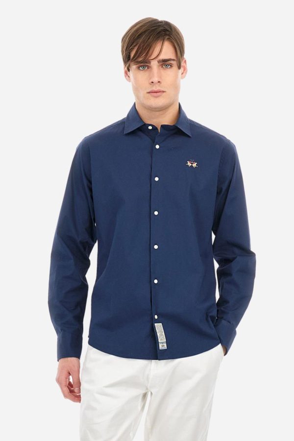 Men’s single-colour long-sleeved shirt, made from 100% cotton poplin. Spread collar. The tricolour logo embroidery is on the chest, left side. The fit is slim. The model is wearing a size L.