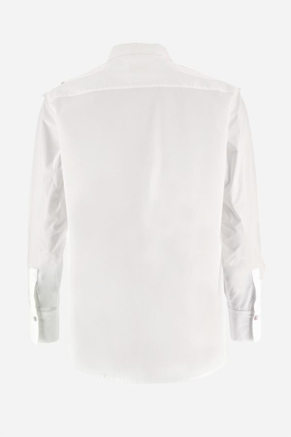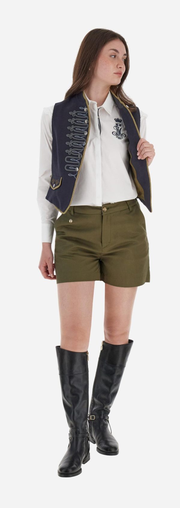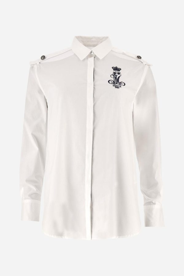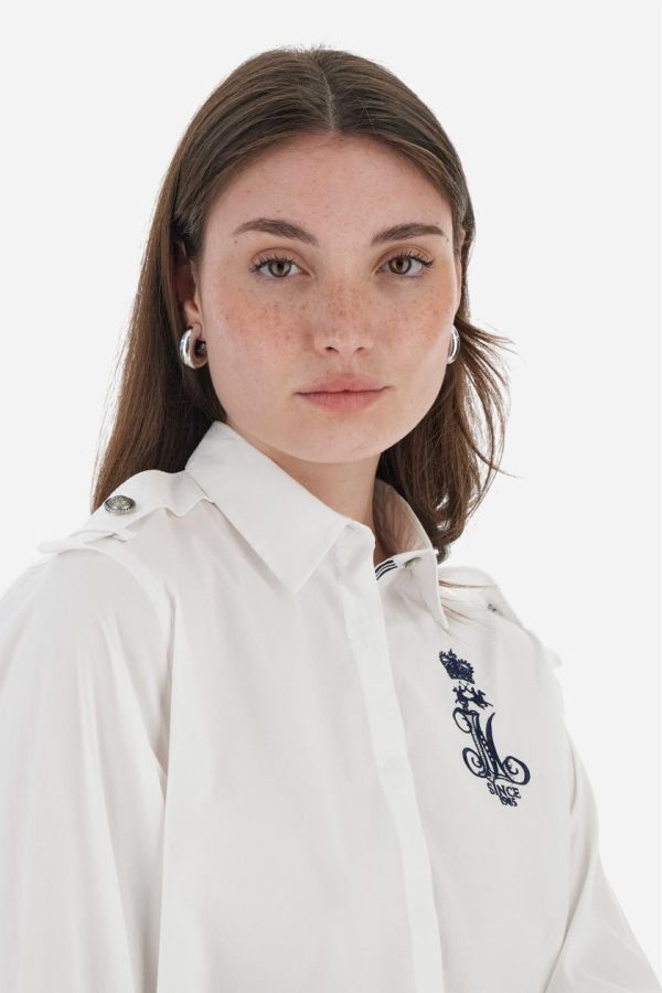 Women’s shirt with single-colour sleeves, made of cotton poplin. French collar and covered buttons on the front. On the shoulders, as a motif detail, there is braiding that fastens with a loop and a large decorative button. On the left chest, the graphic with the large stylised LM and the crown logo is embroidered with contrasting coloured thread. Regular fit. The model is wearing a size 2.