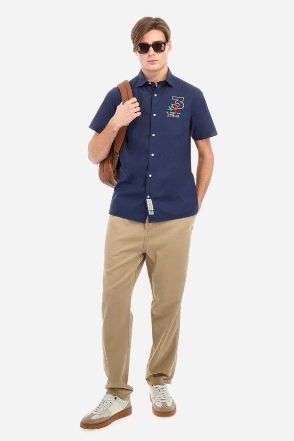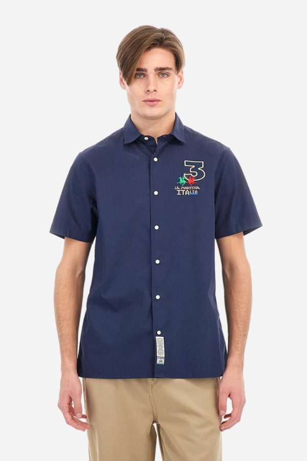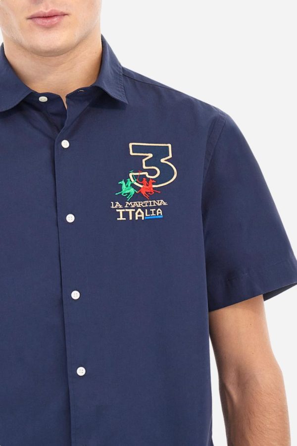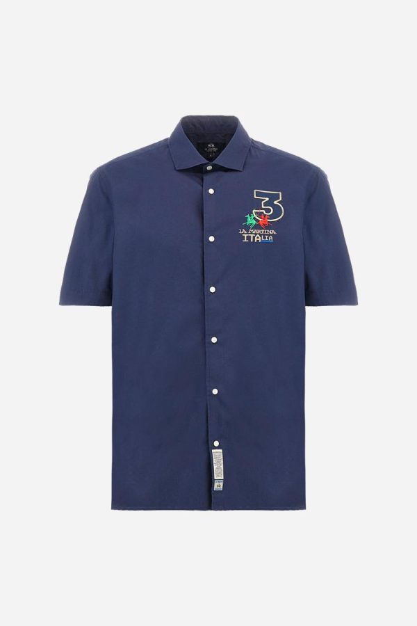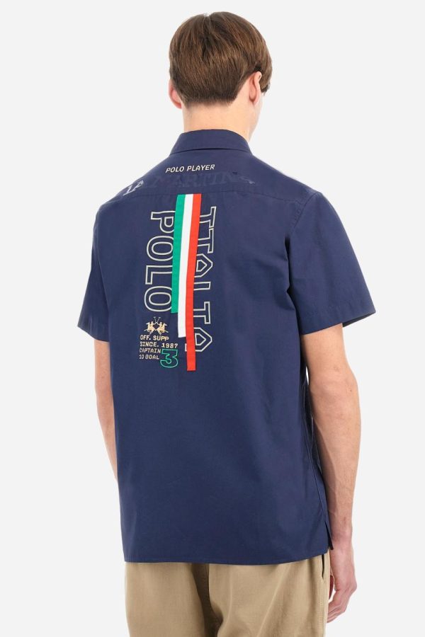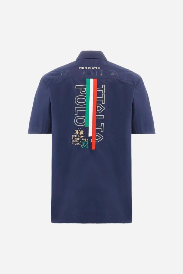 Men’s plain short-sleeved shirt made from cotton poplin. Spread collar and straight hem. The embroidered logo on the chest, over the heart, is designed in the colours of the Italian flag. On the back, the combination of printing and embroidery techniques – depicting lettering, numbers and logos – are enriched with 3 ribbons in the colours of the Italian flag, appliquéd vertically. Regular fit. The model is wearing a size L.