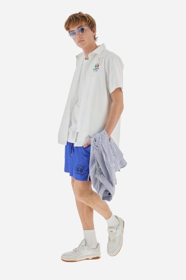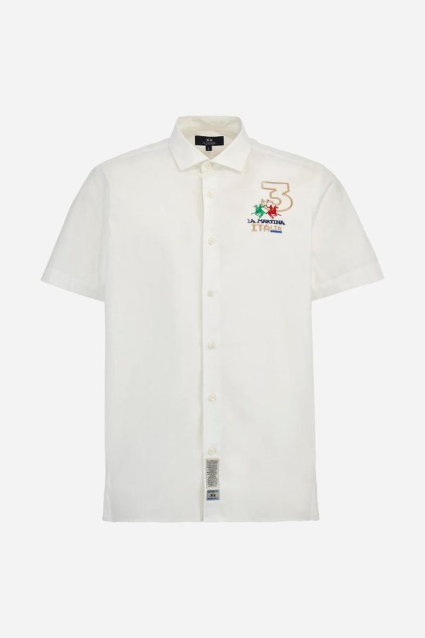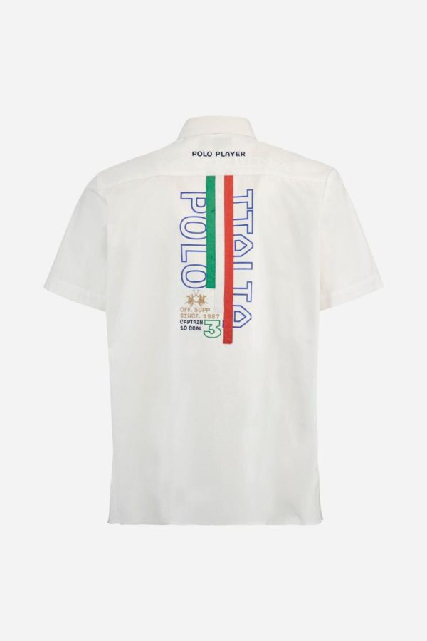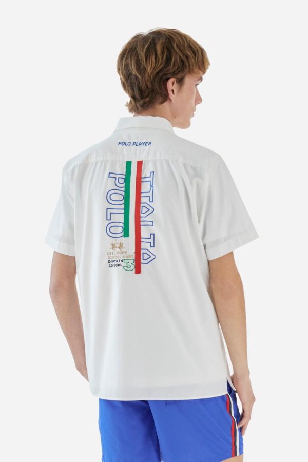 Men’s plain short-sleeved shirt made from cotton poplin. Spread collar and straight hem. The embroidered logo on the chest, over the heart, is designed in the colours of the Italian flag. On the back, the combination of printing and embroidery techniques – depicting lettering, numbers and logos – are enriched with 3 ribbons in the colours of the Italian flag, appliquéd vertically. Regular fit. The model is wearing a size L.