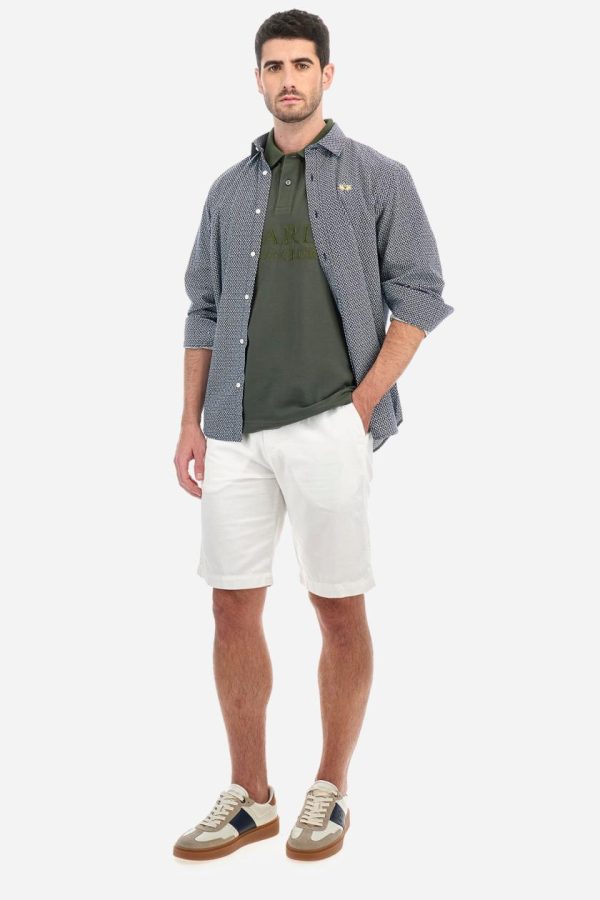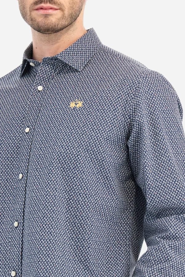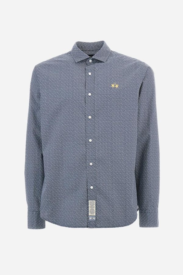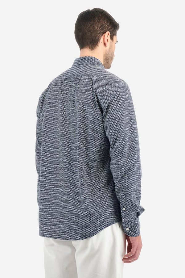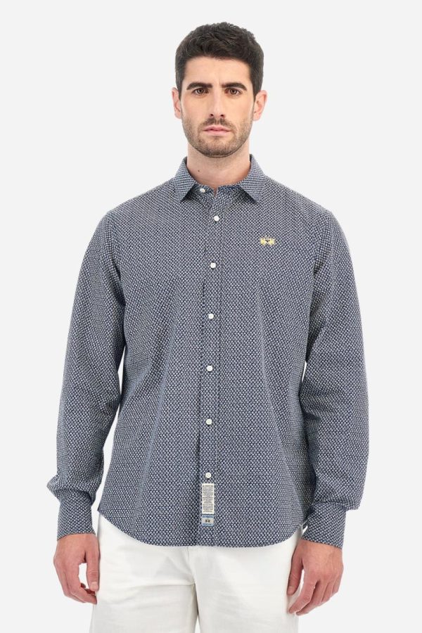 Men’s long-sleeved shirt made from cotton poplin printed with a two-tone graphic design. It features a spread collar and the brand’s classic woven labels at the bottom of the opening. The logo is embroidered in contrasting thread on the left side of the chest. Regular fit. The model is wearing a size L.