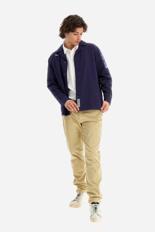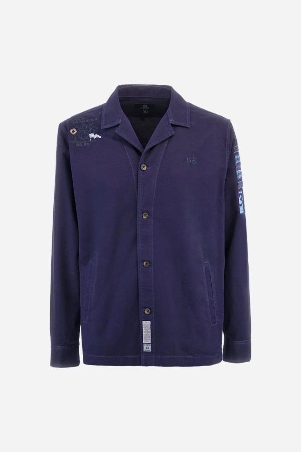 Men’s single-colour long-sleeved overshirt made of 100% cotton slub twill. Bowling collar and jacket opening with inside placket, fastening with imitation horn buttons.On the shoulder and chest the embroidery is in tone with the garment, Argentina lettering embroidered on one shoulder. There are several patches applied on the left sleeve. A tone-on-tone logo is embroidered on the front. Regular fit. The model is wearing a size L.