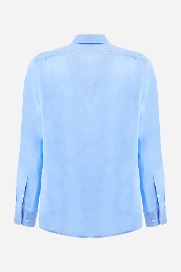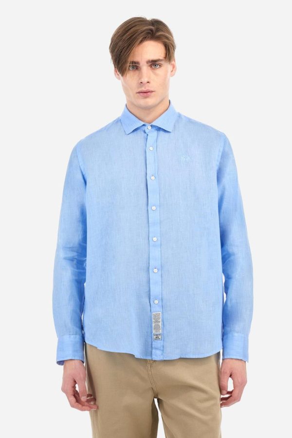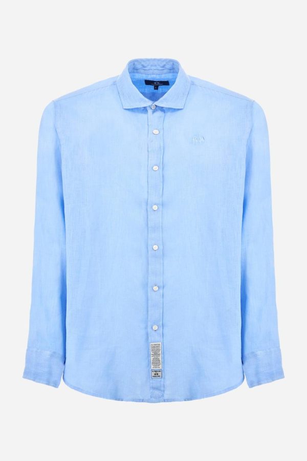 Men’s plain long-sleeved shirt made from linen canvas. Button-down collar. Two fabric patches, depicting the brand’s certification and the Argentine flag, are sewn on the hem of the garment. A tone-on-tone logo is embroidered on the left side of the chest. Regular fit. The model is wearing a size L.