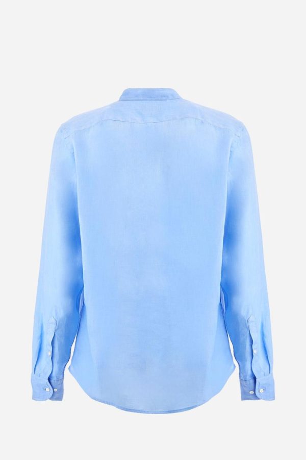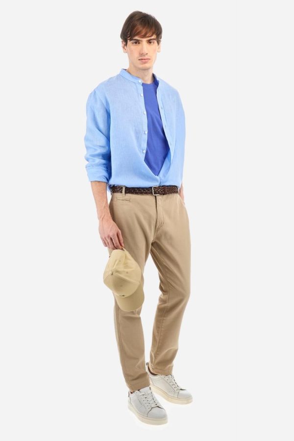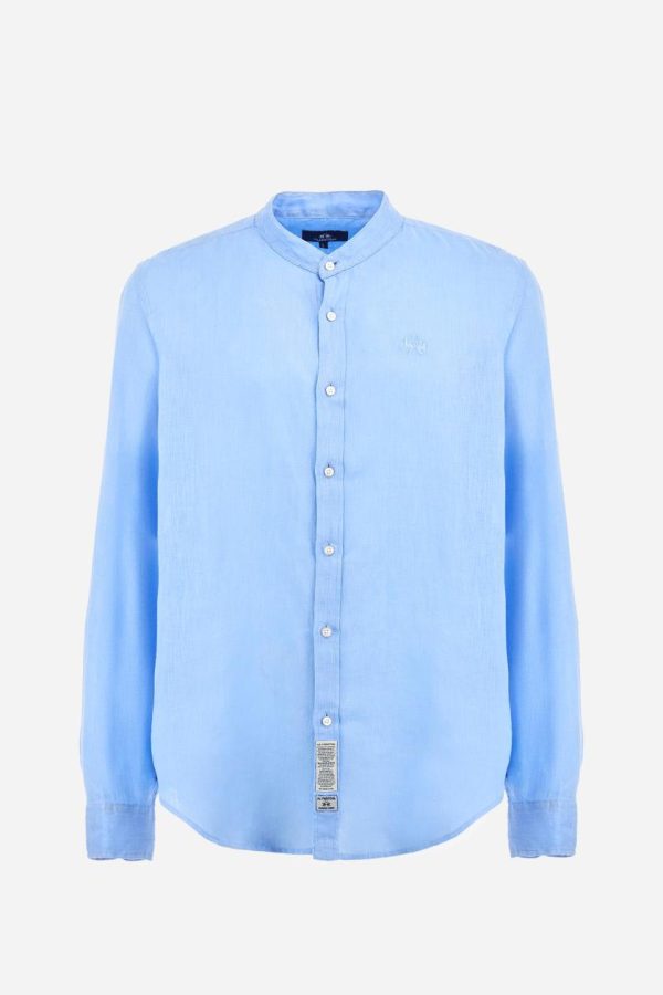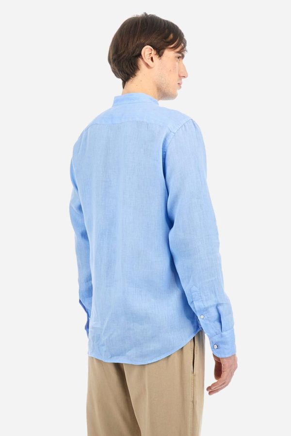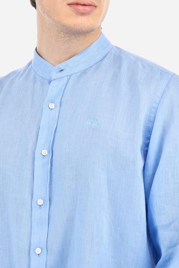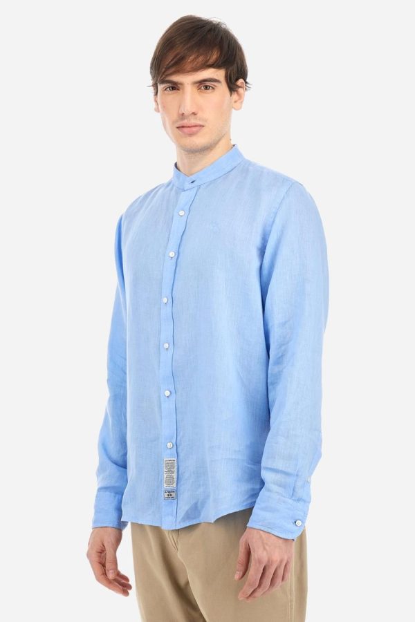 Men’s plain long-sleeved shirt made from linen canvas. The mandarin collar adds a touch of understated elegance. Woven labels depicting the brand’s certification and the Argentine flag are appliquéd on the bottom of the front opening. The logo is embroidered on the chest, over the heart, in tone-on-tone thread. Regular fit. The model is wearing a size L.