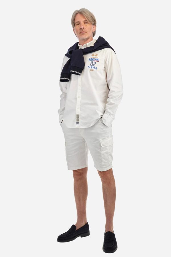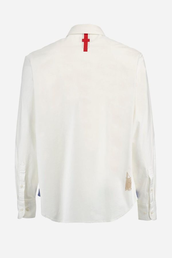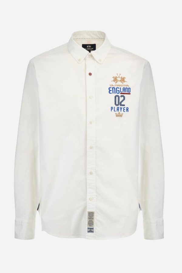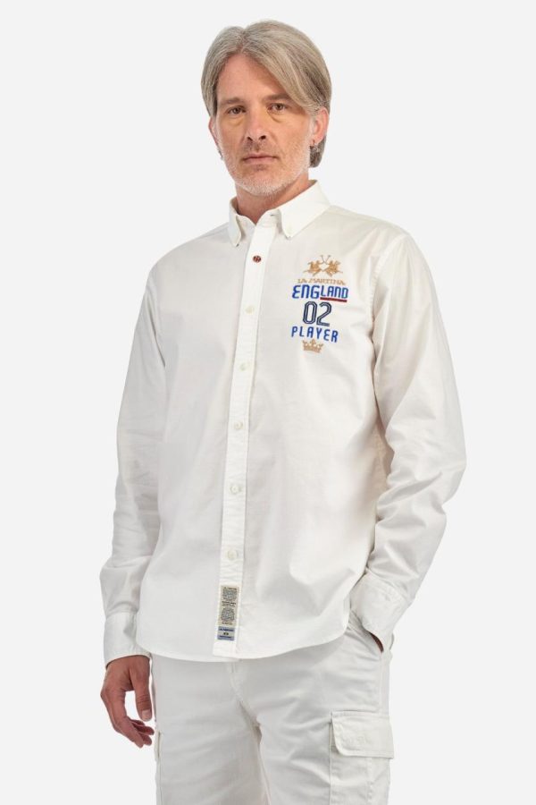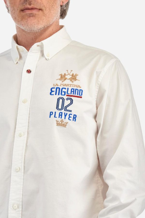 Men’s long-sleeved plain shirt made from 100% Oxford cotton. The button-down collar is finished with a second button printed with the English flag. The multicoloured embroidery on the chest, over the heart, includes lettering, numbers and the logo, which add a distinctive touch. Regular fit. The model is wearing a size L.