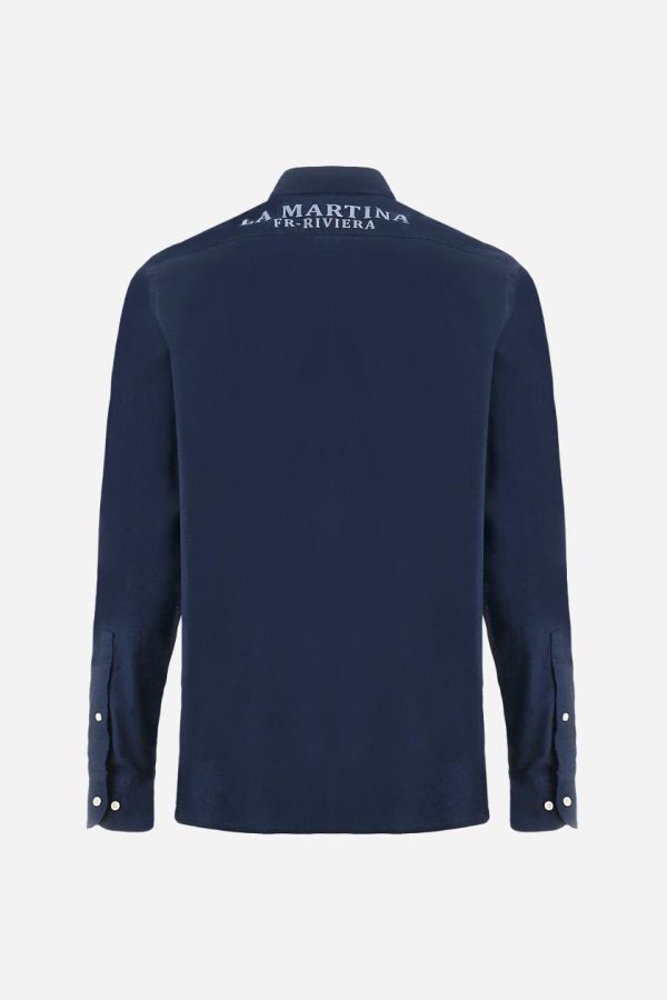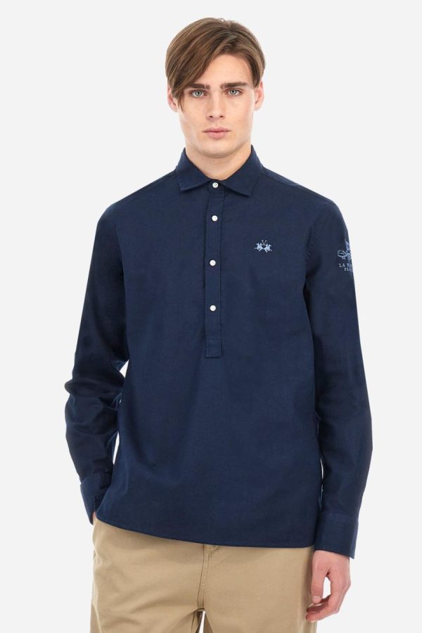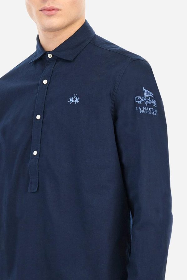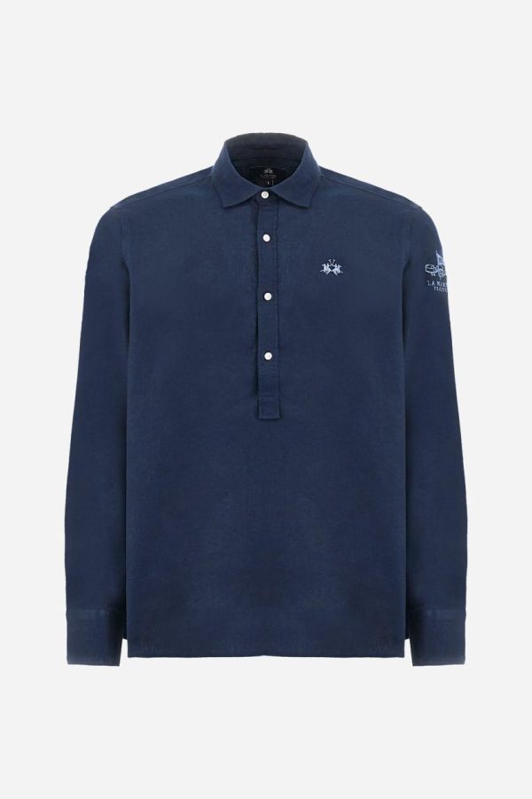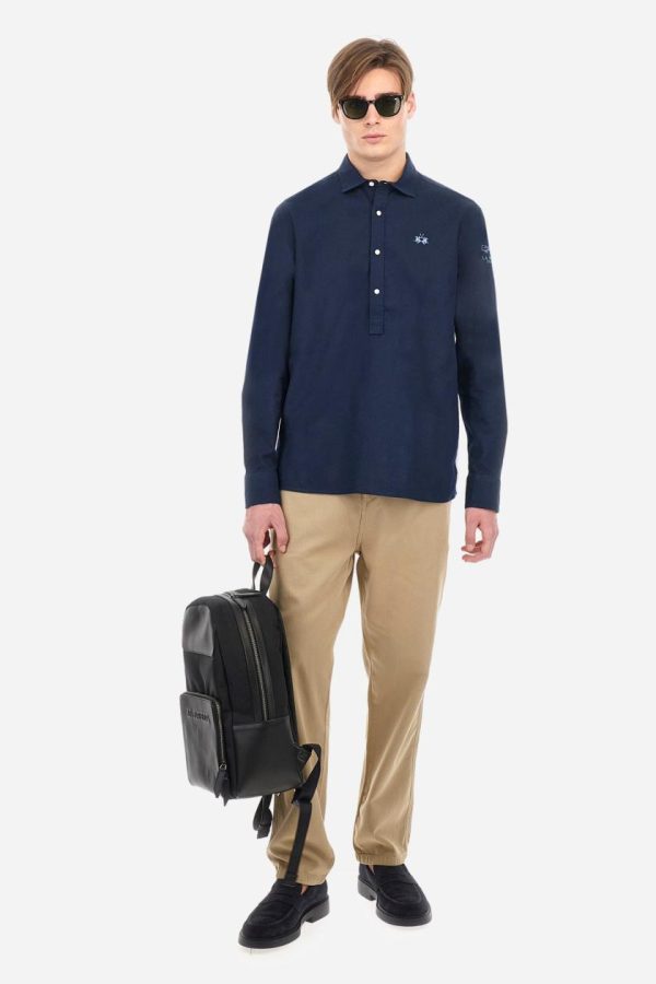 Men’s plain long-sleeved shirt, made from luxurious cotton and linen canvas. The spread collar and the opening, which reaches the waist, are closed with 4 buttons. The left bicep is embellished with embroidered graphics depicting lettering, crests and numbers, created using contrasting thread. The logo is embroidered in contrasting thread on the left side of the chest. The regular fit offers a refined and comfortable look. The model is wearing a size L.