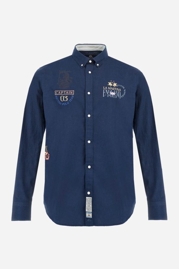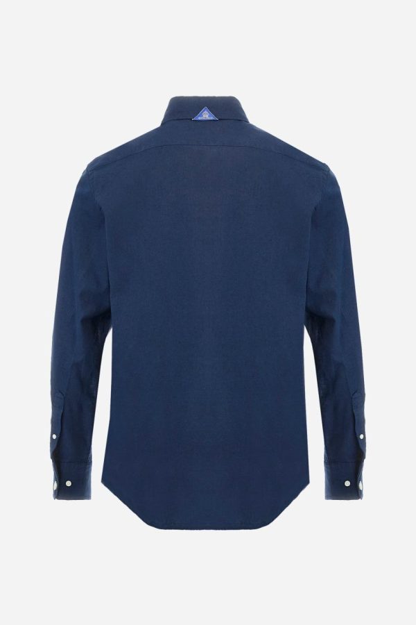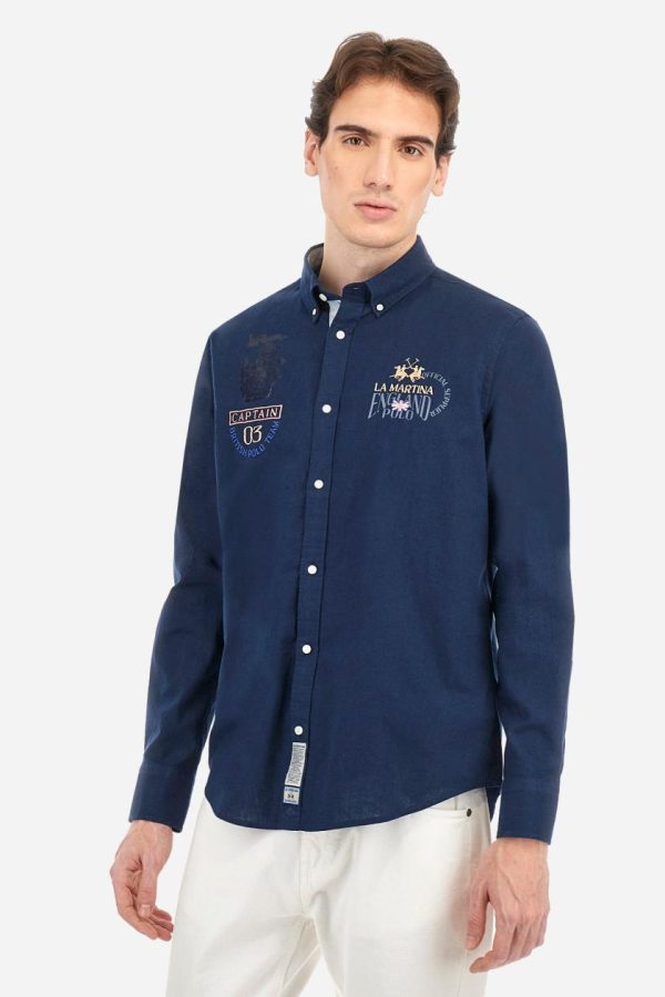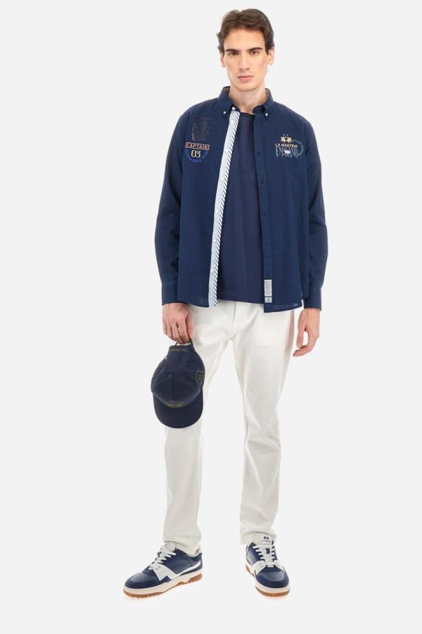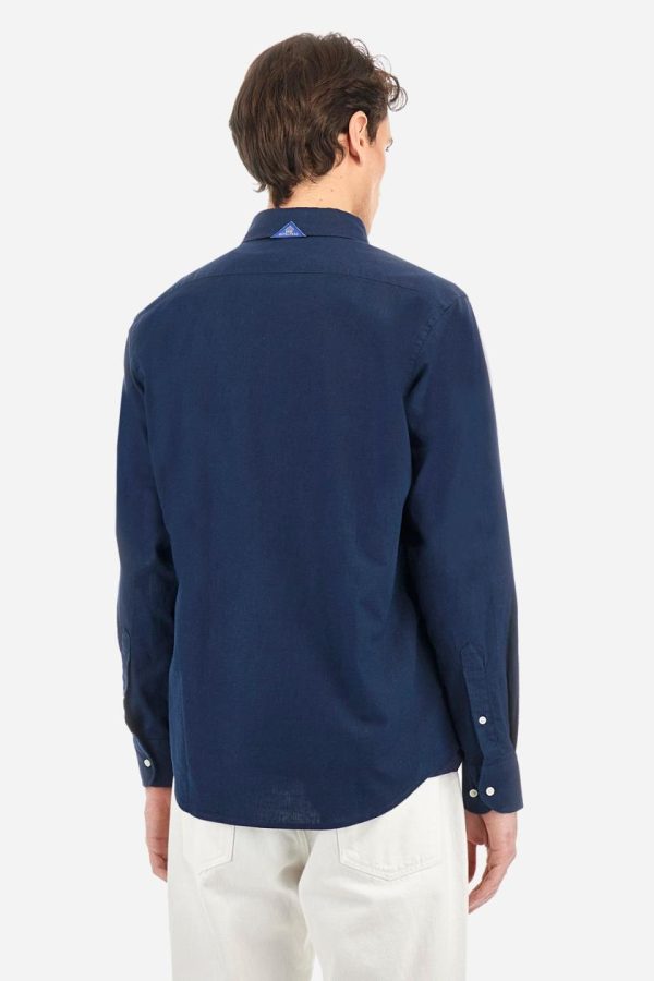 Men’s long-sleeved single-colour shirt made of cotton and linen canvas. Button-down collar. Featuring details on the inside of the collar and opening in contrasting colour printed fabrics. The front graphics and logo are embroidered with contrasting colour threads. The fit is regular. The model is wearing a size L.