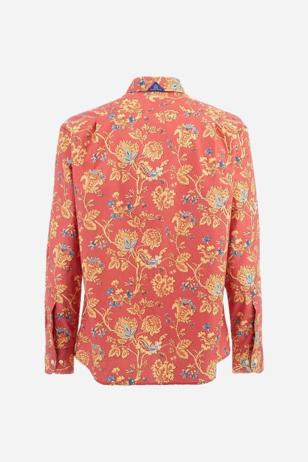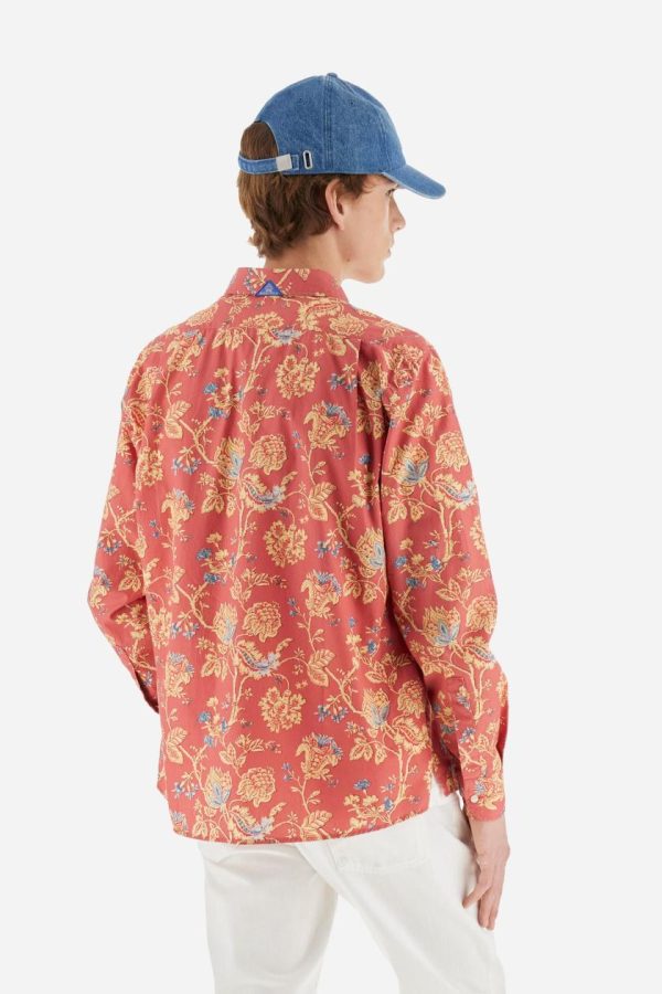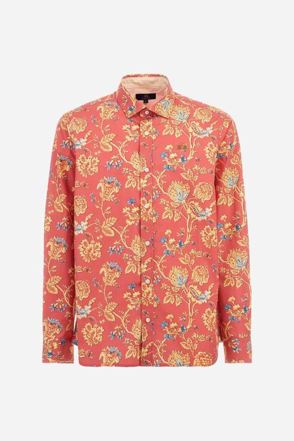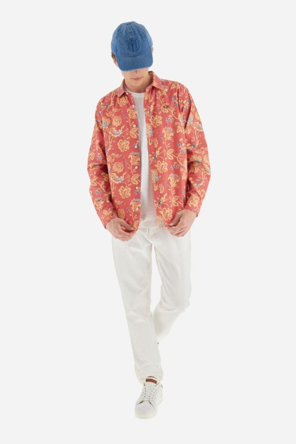 Men’s long-sleeved shirt with floral pattern print. Made in 100% poplin cotton. Spread collar. The print design recalls cashmere patterns revisited in a modern key with contrasting colours. The logo is embroidered in a contrasting colour thread on the left side of the chest. The fit is regular. The model is wearing a size L.