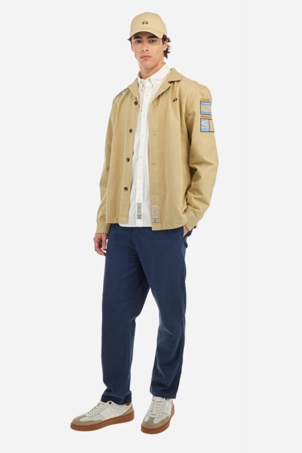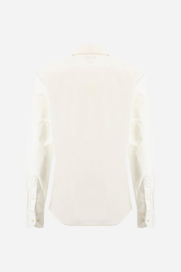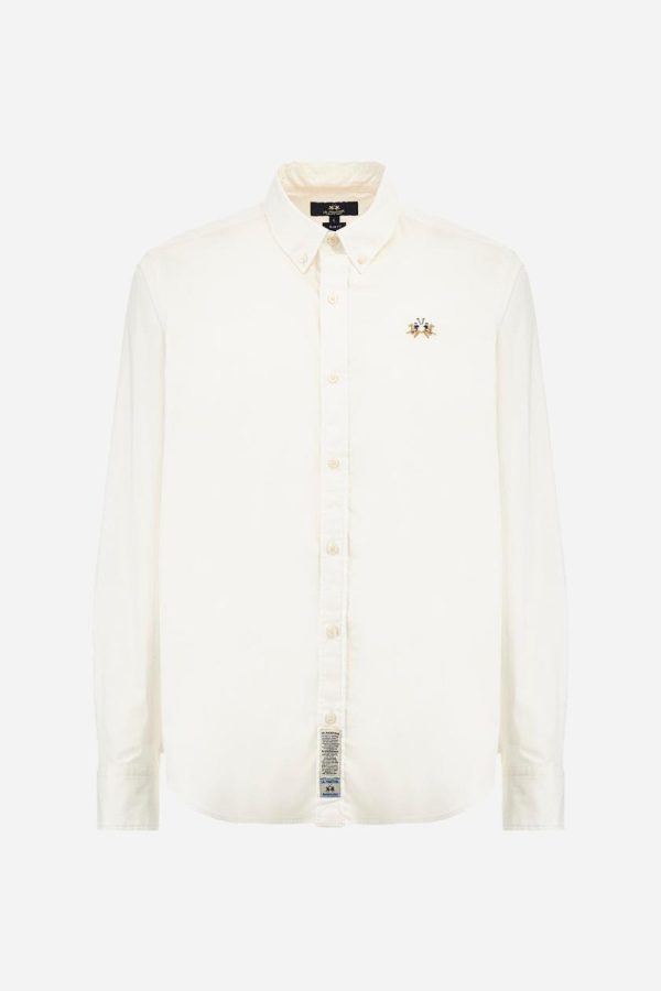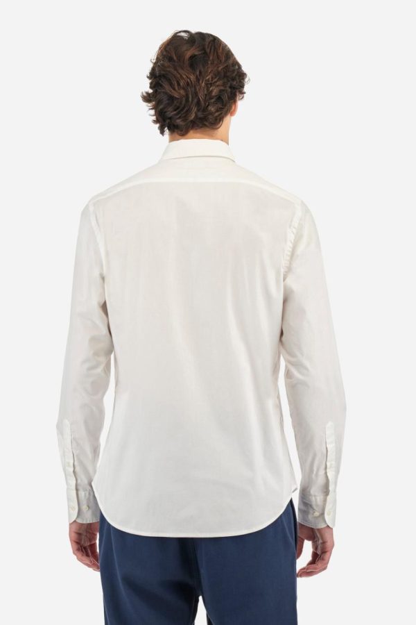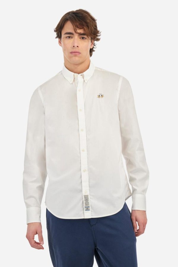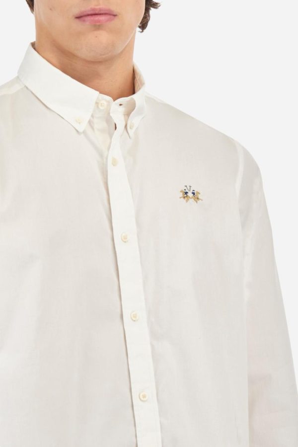 Men’s plain long-sleeved shirt made from stretch cotton poplin for a comfortable fit. Featuring a button-down collar and woven labels at the bottom of the opening. A multicoloured logo is embroidered on the chest, over the heart, in contrasting thread. The slim fit ensures a sleek and modern look. The model is wearing a size L.
