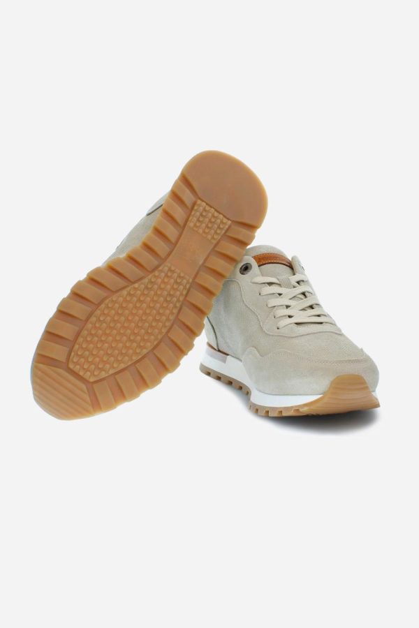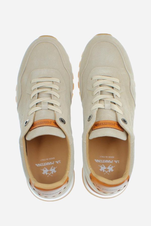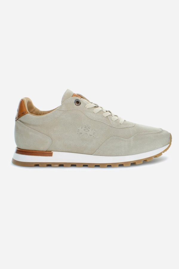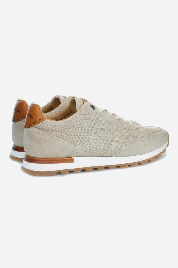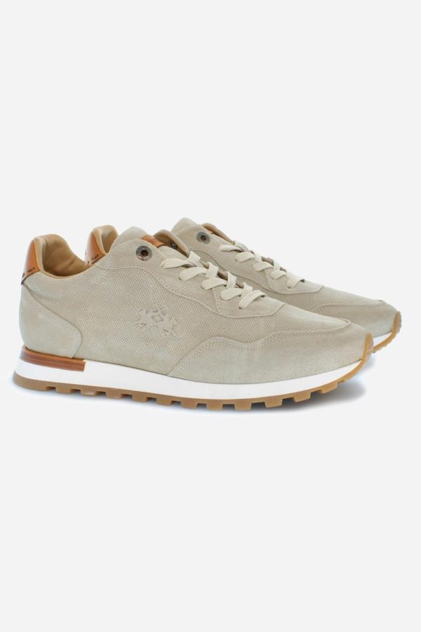 A trainer in a special version made of soft micro-perforated faded suede, with contrasting leather details on the tongue and upper, finished with hand-sewn stitching. The tonal La Martina lettering is embossed on the tongue. The logo is embossed on the side, while the custom eyelets complete the design, giving a distinctive and artisanal touch to the shoe.