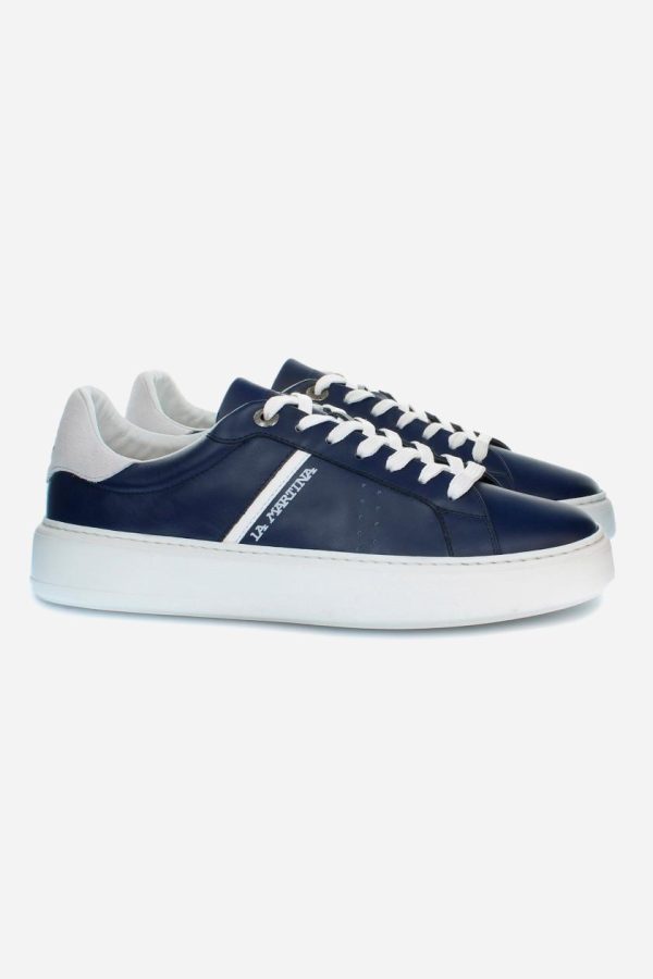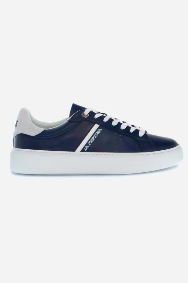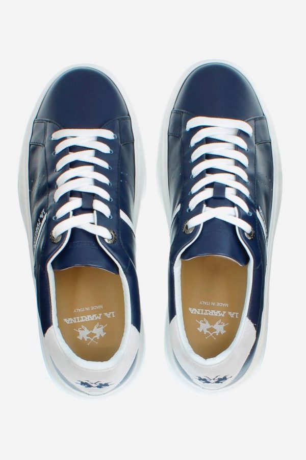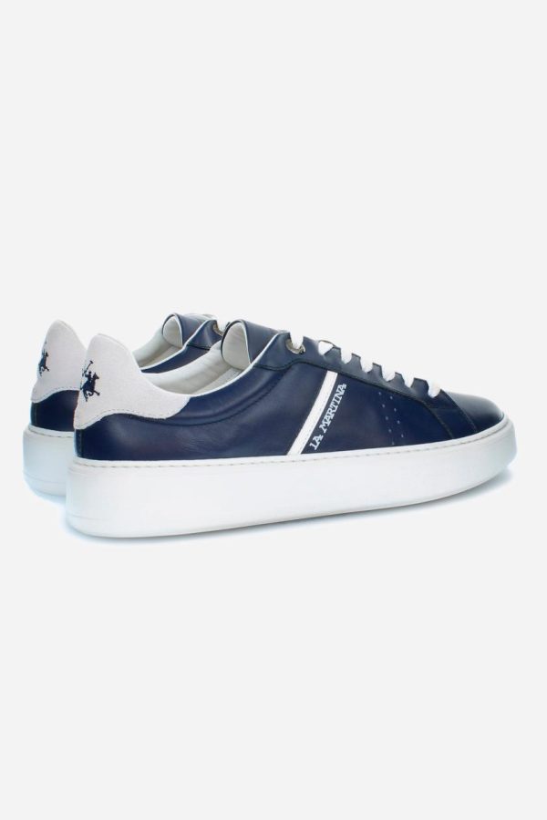 The shoe features a leather upper with an exclusive and customised sole in lightweight EVA. Contrasting La Martina lettering is found on the side, emphasised by a leather trim. The logo is embroidered in contrast on the patch, while the La Martina lettering is embossed on the tongue. Distinctive details include side perforations and hand-sewn stitching, a custom footbed and Strobel construction for a comfortable, flexible fit.