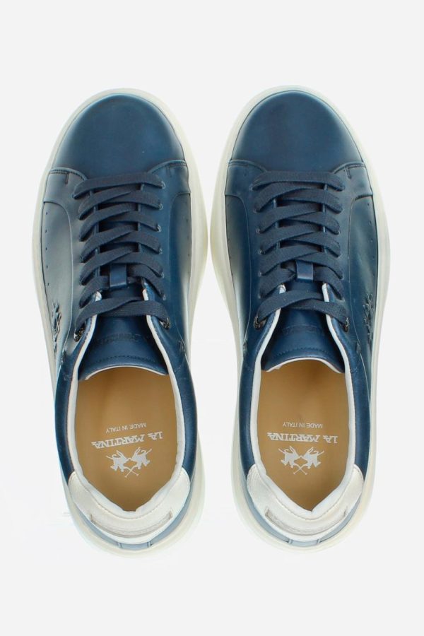 The shoe features a monochrome design in brushed leather, which gives a vintage effect, and an exclusive lightweight EVA sole with the La Martina signature. The tongue is embellished with embossed La Martina lettering, while a contrasting patch on the top features the screen-printed logo. The logo is visible in high frequency on the side of the shoe. Distinctive details include side perforations and hand-stitched seams, complemented by a custom footbed for optimum comfort.
