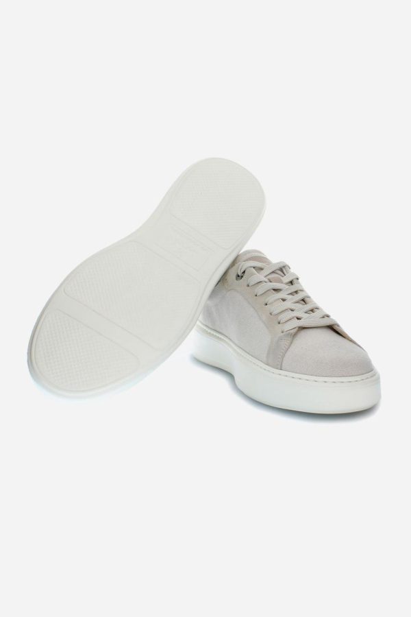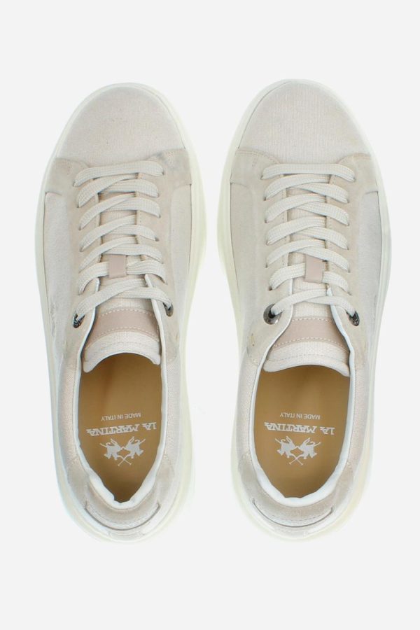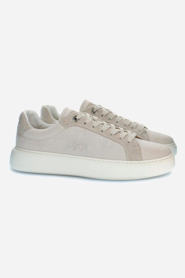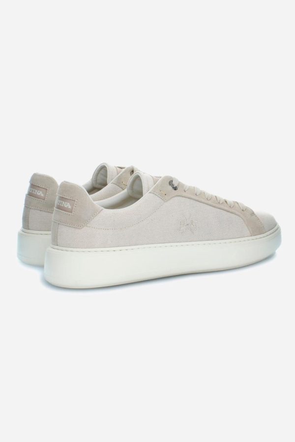 This sports shoe is made of linen canvas and suede, mounted on an exclusive and customised sole in lightweight EVA. The logo is embroidered on the outside, while the La Martina lettering is heat-stamped on the tongue and screen-printed on the tonal patch. Details include hand-sewn stitching, a custom footbed for maximum comfort, and a Strobel construction that ensures flexibility and durability.