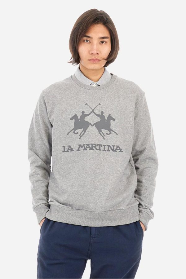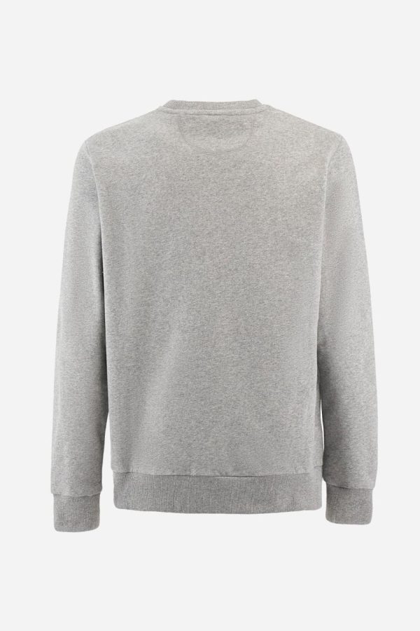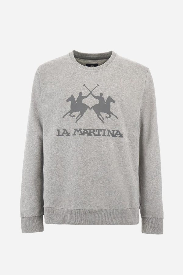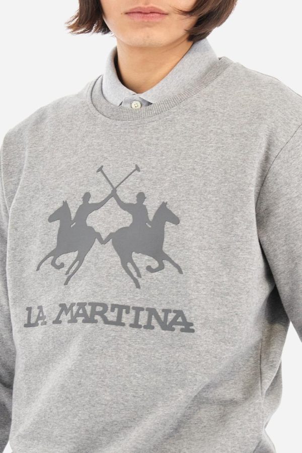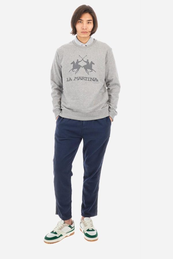 Men’s long-sleeved crew-neck sweatshirt made of 100% cotton in a solid colour, featuring a large patch logo on the front in a contrasting colour. Perfect worn with trousers or Bermuda shorts for a casual and trendy look. The model is 187 cm tall and wears a size L.