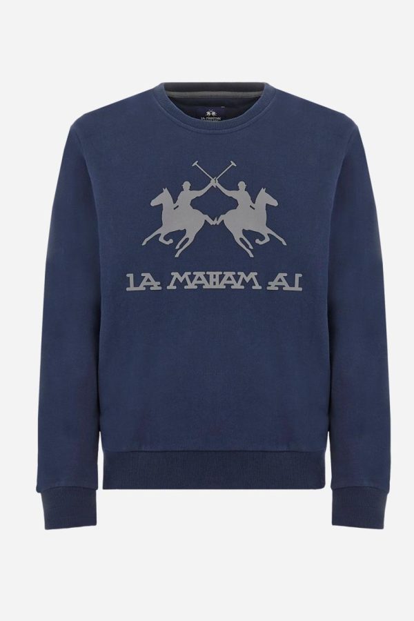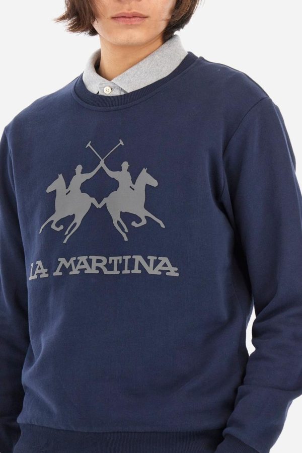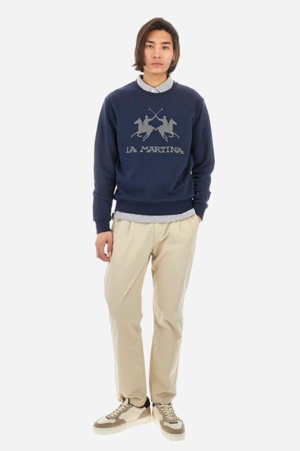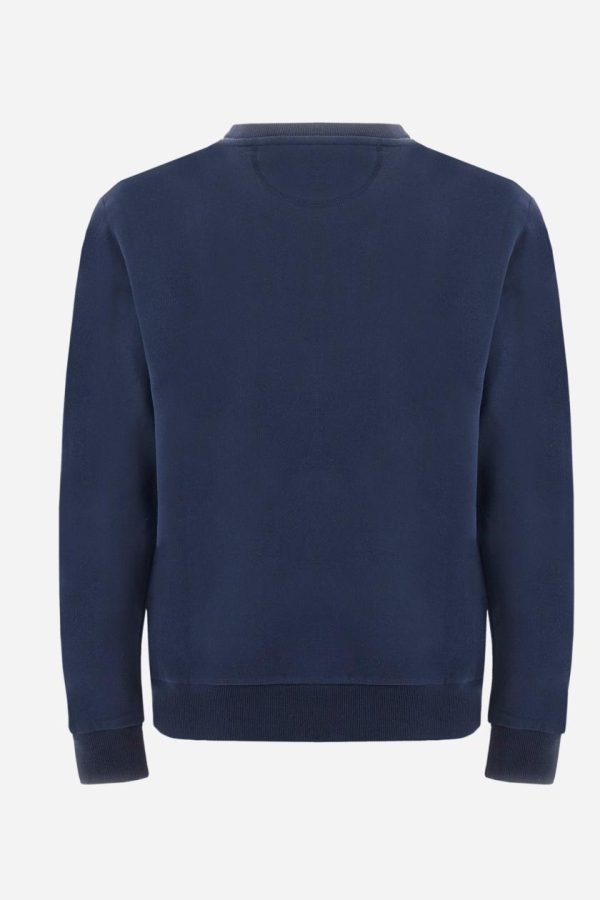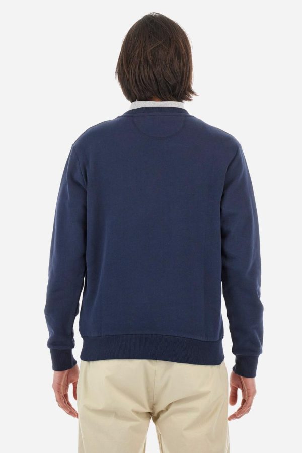 Men’s long-sleeved crew-neck sweatshirt made of 100% cotton in a solid colour, featuring a large patch logo on the front in a contrasting colour. Perfect worn with trousers or Bermuda shorts for a casual and trendy look. The model is 187 cm tall and wears a size L.