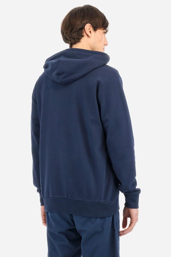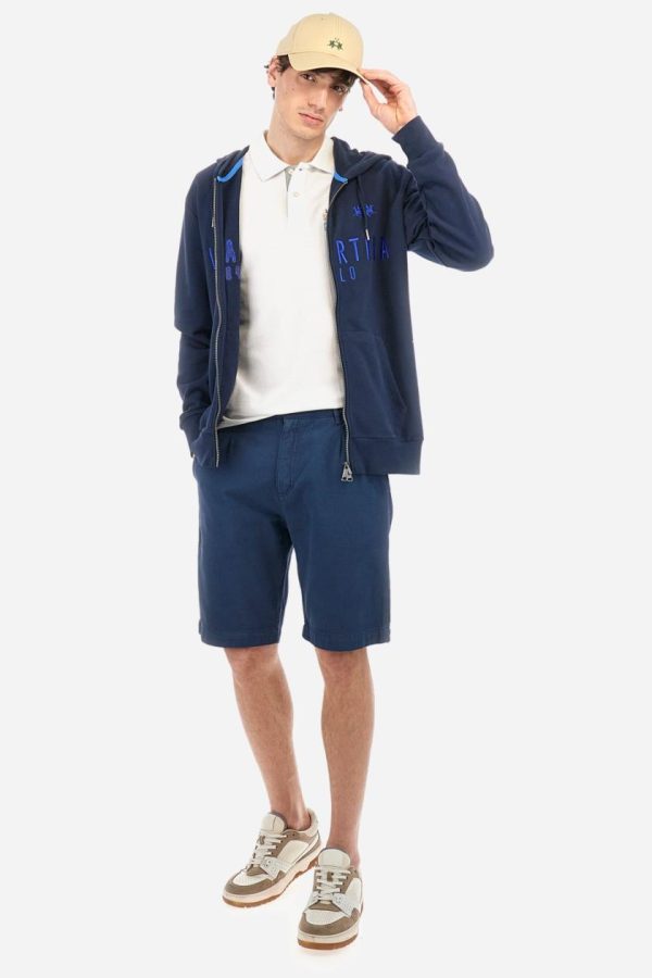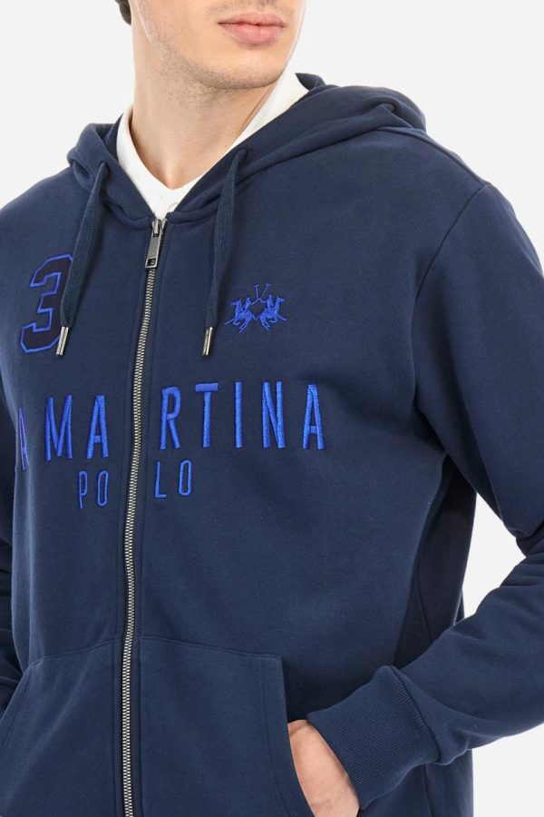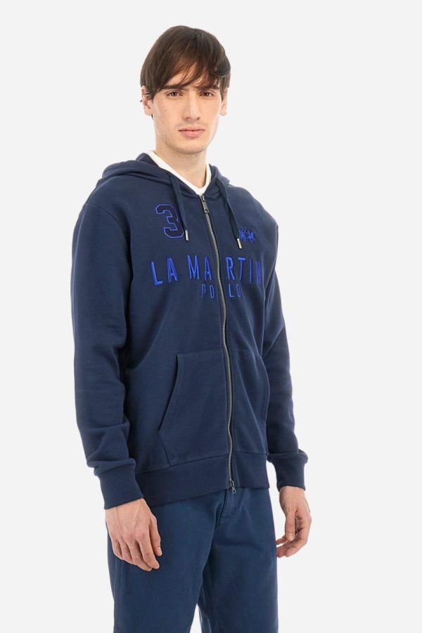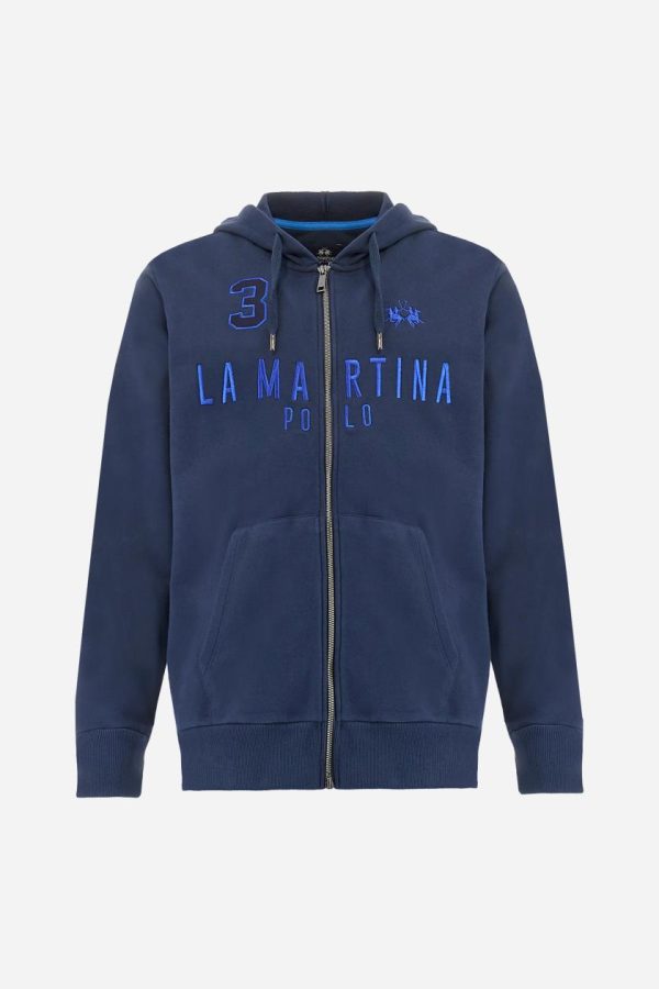 Men’s long-sleeved plain sweatshirt made from French terry cotton. Full-zip fastening and hood with adjustable drawstring. On the chest, the La Martina Polo lettering is present as a large, slightly embossed embroidery, while the number 3 is present as a patch made of the same fabric and applied with an embroidered cord in a contrasting colour. The logo is embroidered on the chest, left side. Regular fit. The model is wearing a size L.