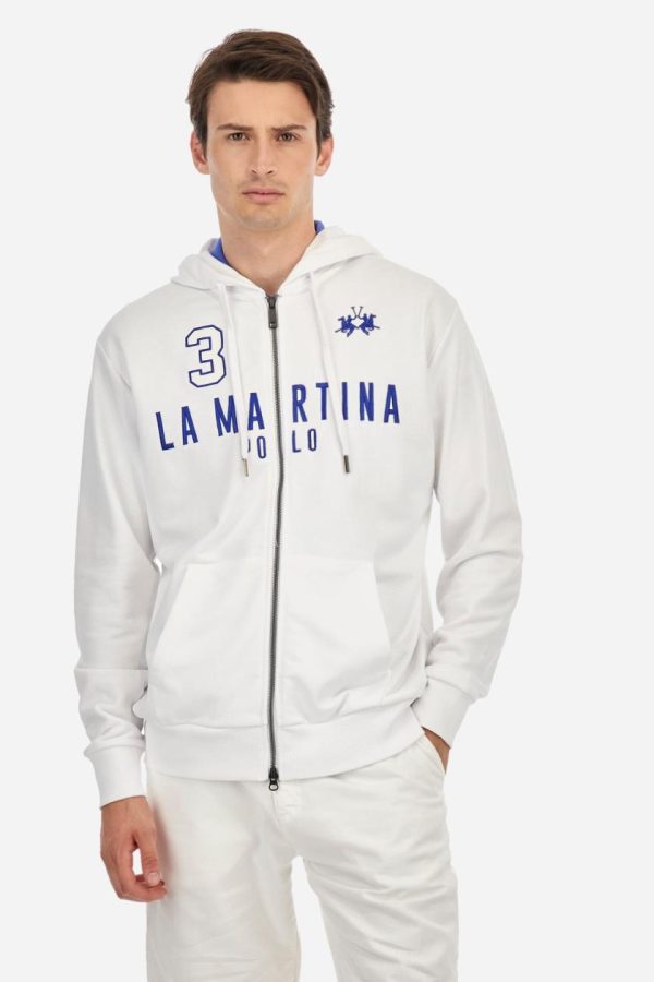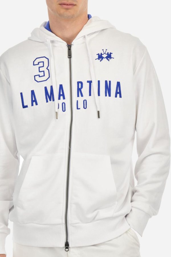 Men’s long-sleeved plain sweatshirt made from French terry cotton. Full-zip fastening and hood with adjustable drawstring. On the chest, the La Martina Polo lettering is present as a large, slightly embossed embroidery, while the number 3 is present as a patch made of the same fabric and applied with an embroidered cord in a contrasting colour. The logo is embroidered on the chest, left side. Regular fit. The model is wearing a size L.
