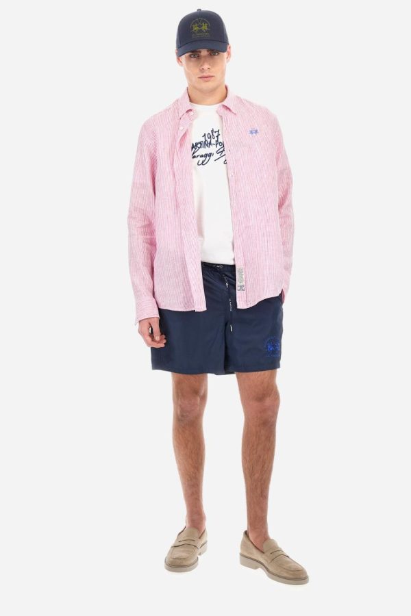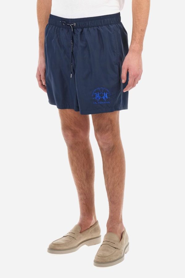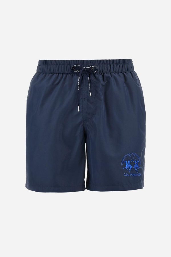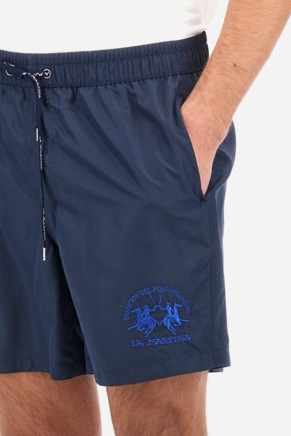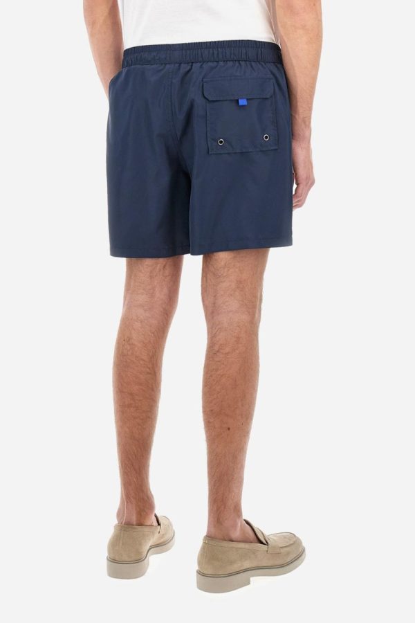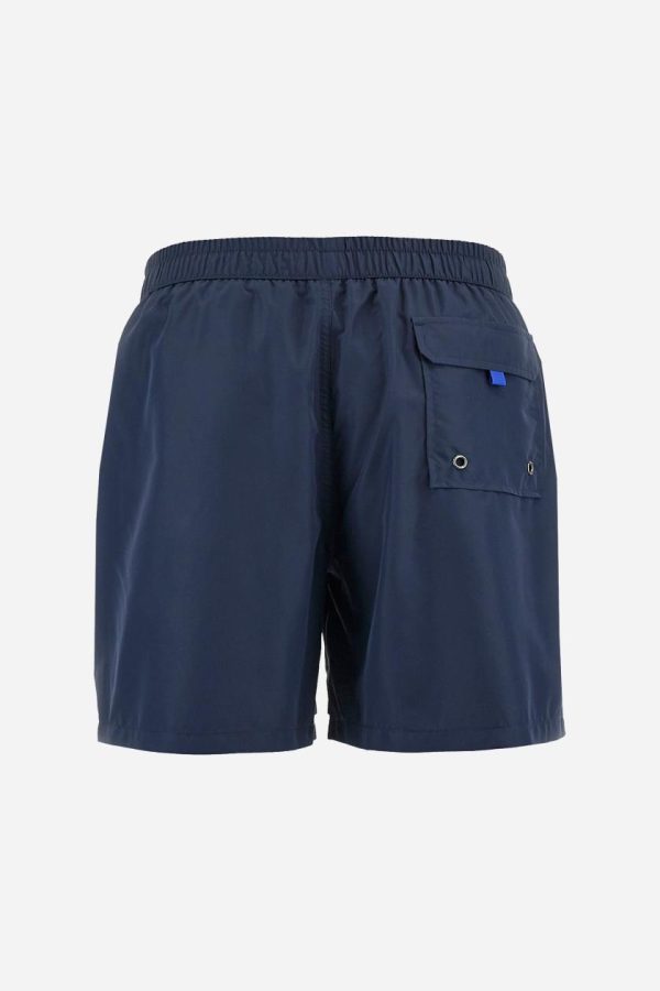 Plain men’s swimming shorts made of nylon. Elastic waistband with a personalised drawstring for waist adjustment. On the inside of the shorts is an elasticated mesh brief. Double side pocket on the hips and patch pocket with flap on the back, on the right side only. The large logo is embroidered in a contrasting colour thread on the bottom of the left leg on the front. Regular fit. The model is wearing a size L.