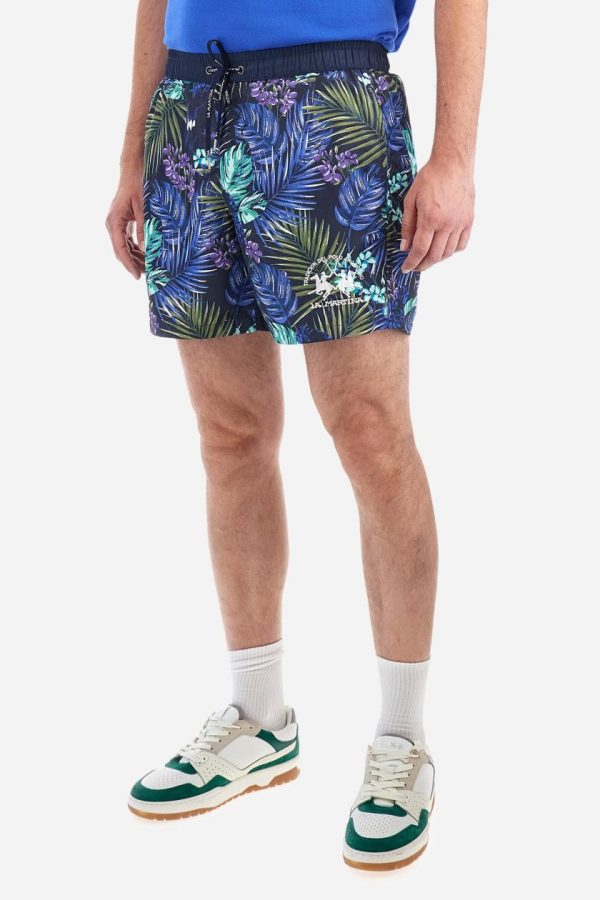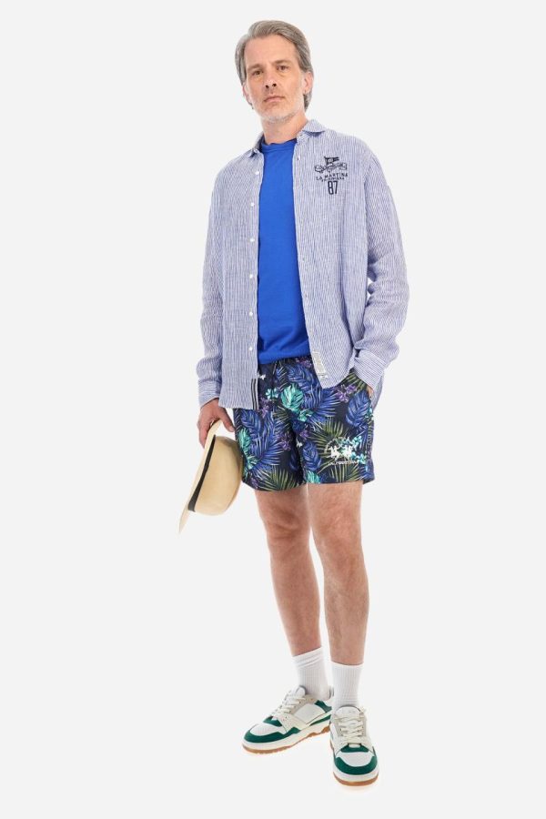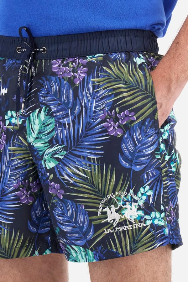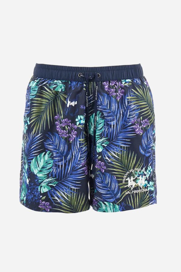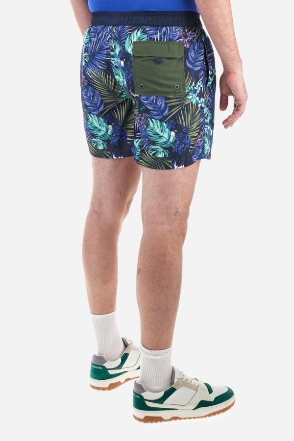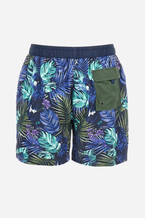 Men’s swimming shorts, made of 100% nylon. Printed with a tropical pattern. Inside there is an elasticated mesh slip. Double side pocket, single patch pocket on the back in contrasting colour. Elastic strap in colour-contrasting nylon. Drawstring for waist adjustment. The large logo is embroidered in contrast at the bottom on the left side. Regular fit. The model is wearing a size L.