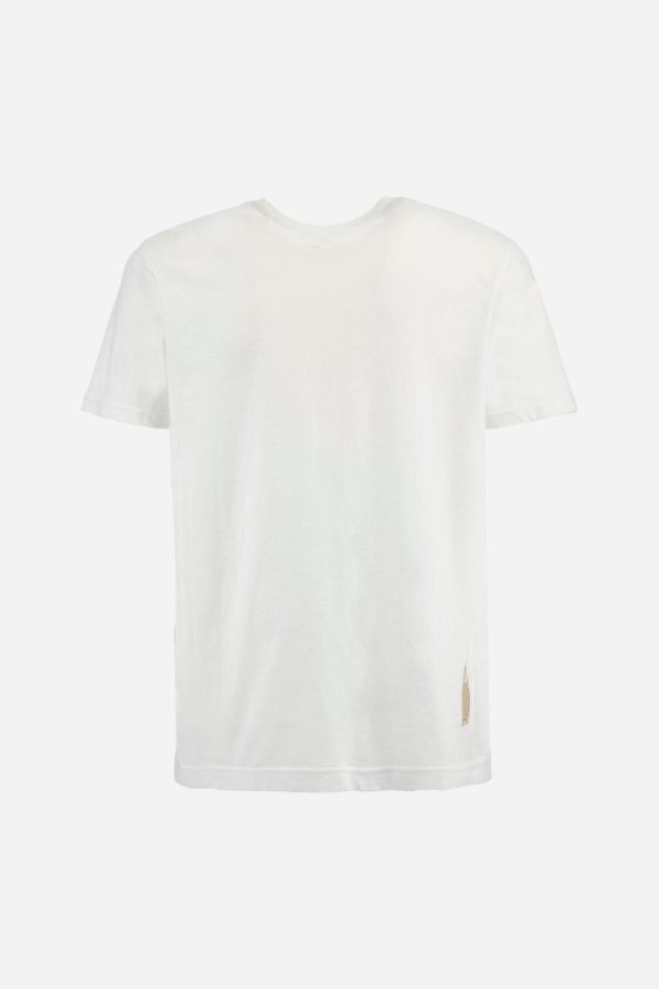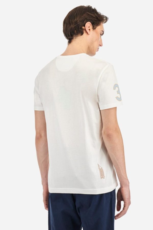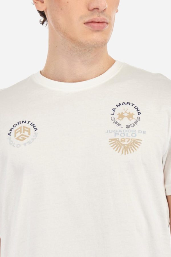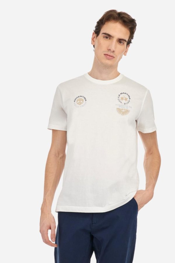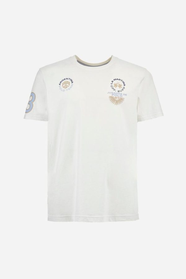 Men’s plain cotton jersey T-shirt. Crew-neck model with matching ribbed collar. A contrasting jersey ribbon is applied on the inside of the collar. On the chest we find two graphics, both printed with contrasting colours and gold, that make references to Argentina. On the right sleeve the number 3 is present as a two-tone print with a slightly rubberised appearance. The logo and the La Martina lettering are printed on the chest, left side. Regular fit. The model is wearing a size L.