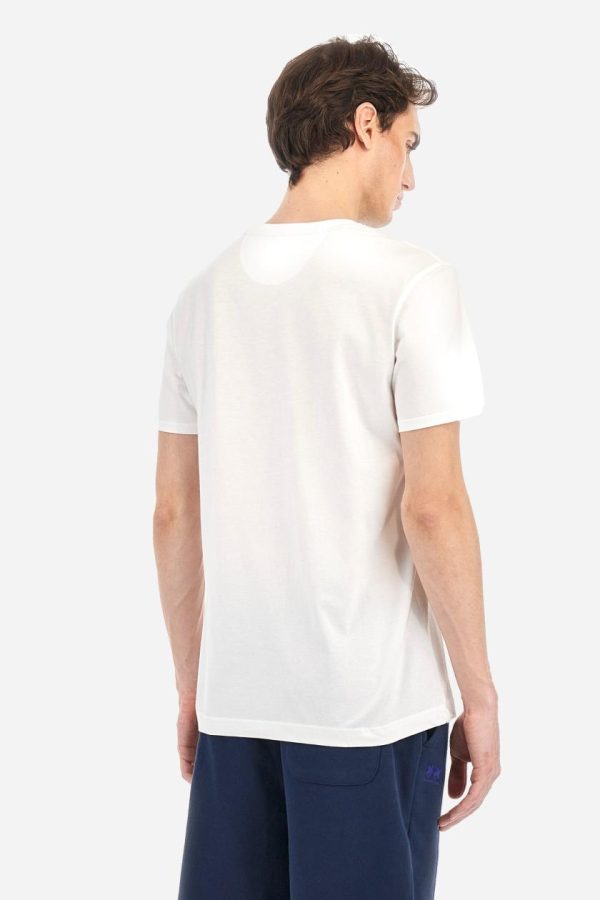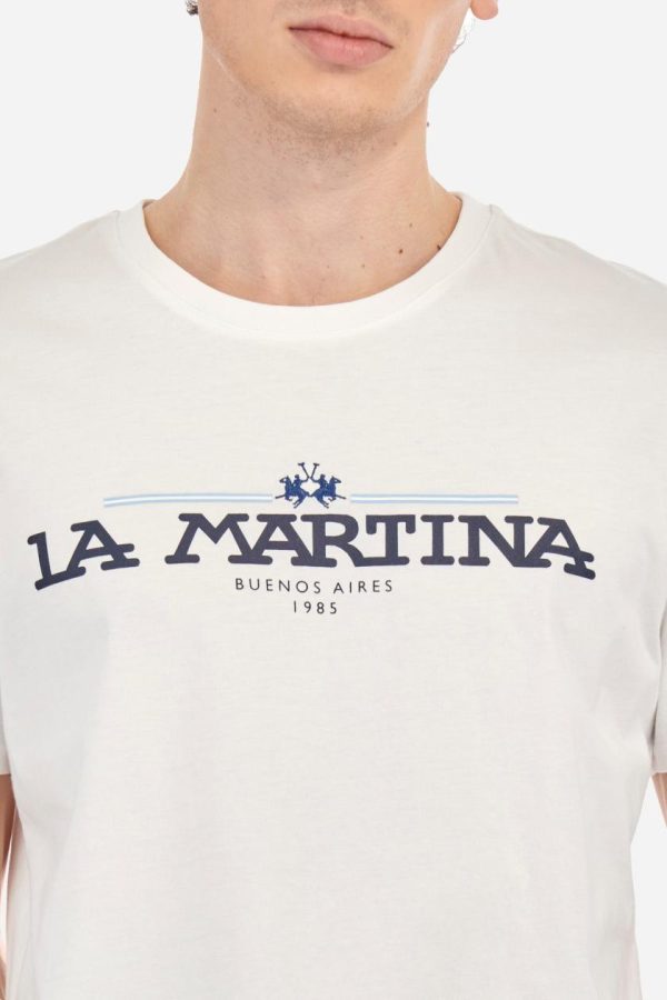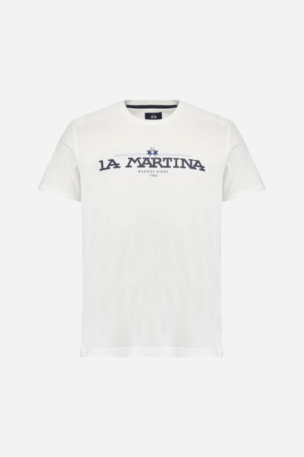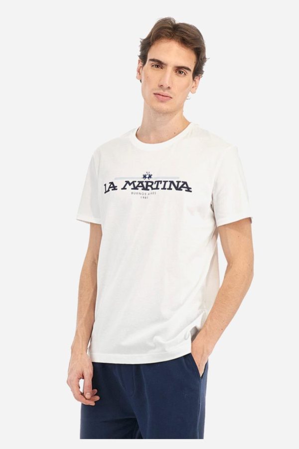 Men’s solid color T-shirt, made of cotton jersey. Crew neck. The front features the La Martina text in print. The logo is embroidered on the front, in the center of the chest. The fit is regular. The model is wearing size L.