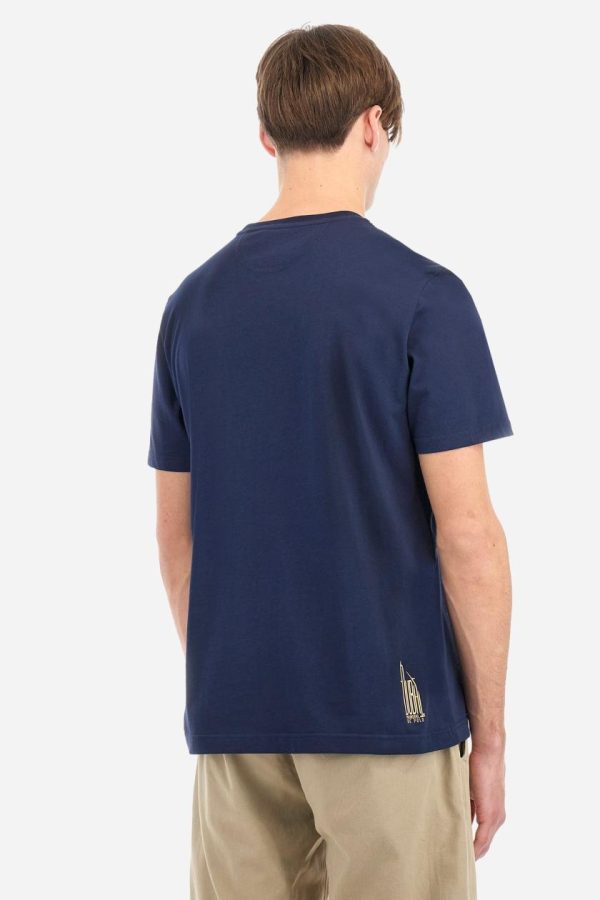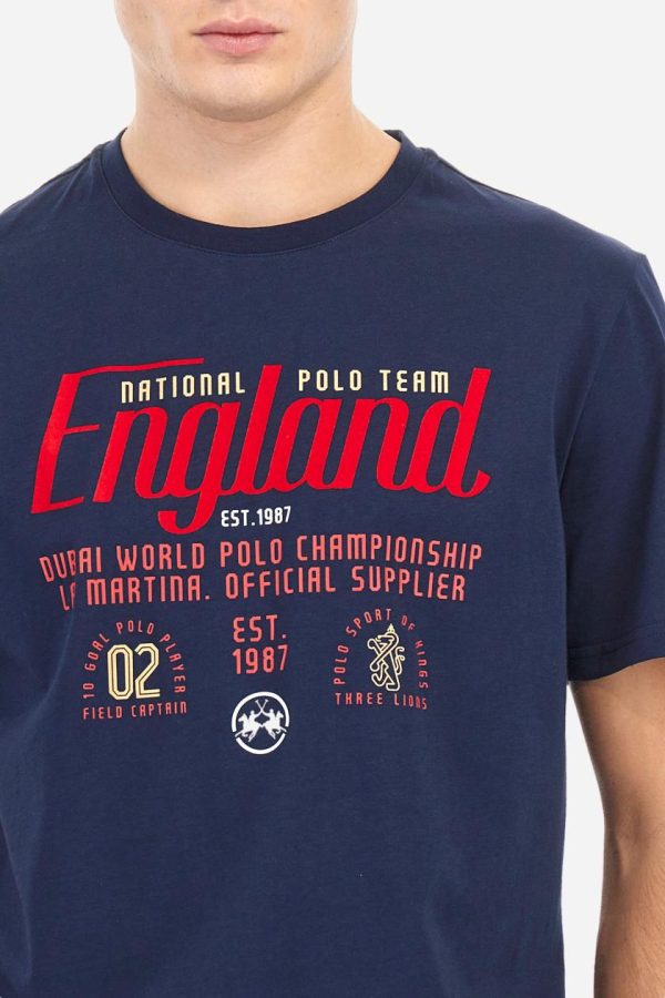 Men’s plain cotton jersey T-shirt. Crew-neck model with ribbed collar. The large print on the chest and the additional lettering and logos are printed in contrasting colours and are inspired by the Polo World Championships in Dubai. A contrasting jersey ribbon is applied on the inside of the neck. At the back, bottom right, the gold-coloured rubberised transfer also celebrates the World Cup in Dubai. The logo is printed with a rubberised effect on the front. Regular fit. The model is wearing a size L.