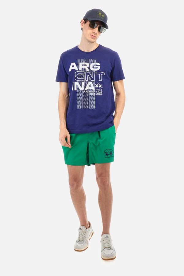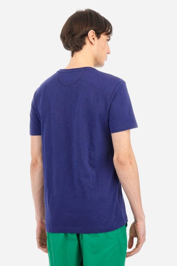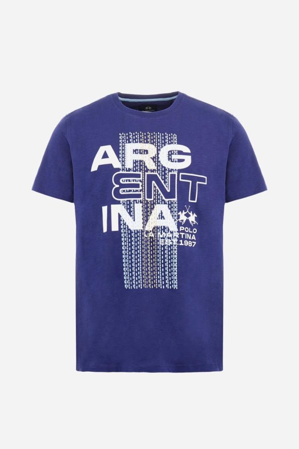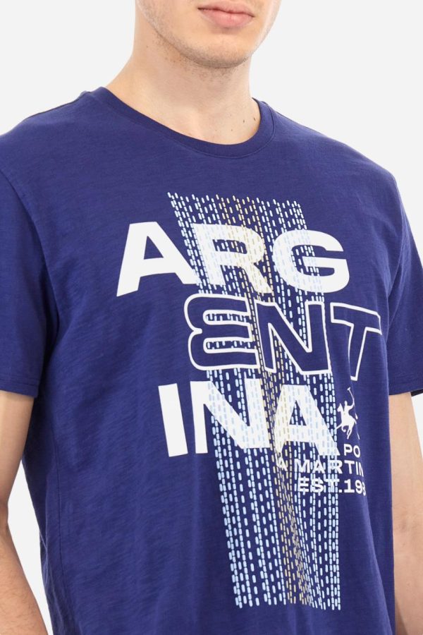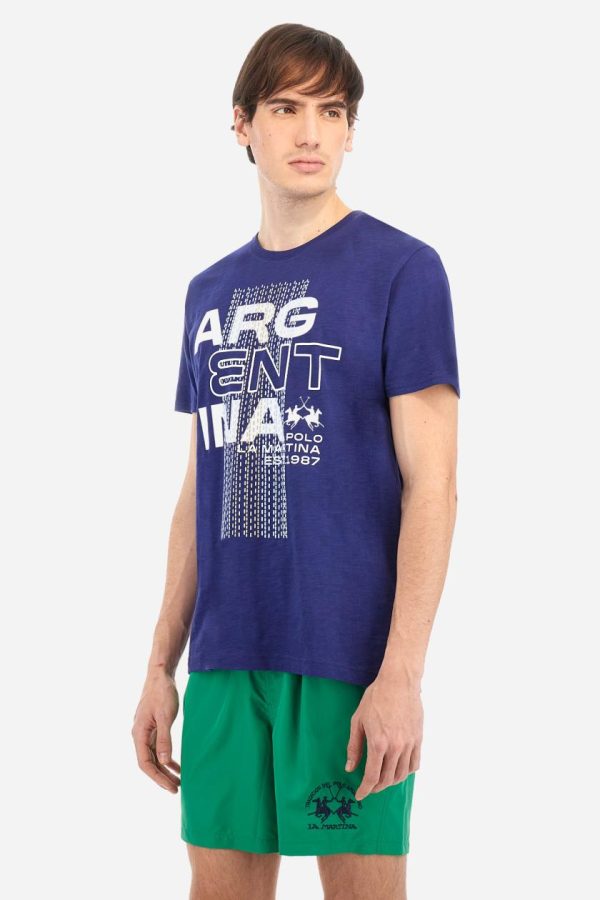 Men’s T-shirt with plain sleeves, made of slub jersey. Ribbed crew neck. The graphic on the chest is a multicoloured rubberised print. The dotted effect is also a slightly raised embroidery effect print. The logo is printed on the front. Regular fit. The model is wearing a size L.