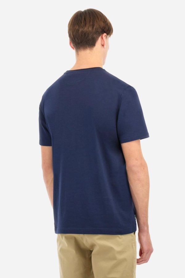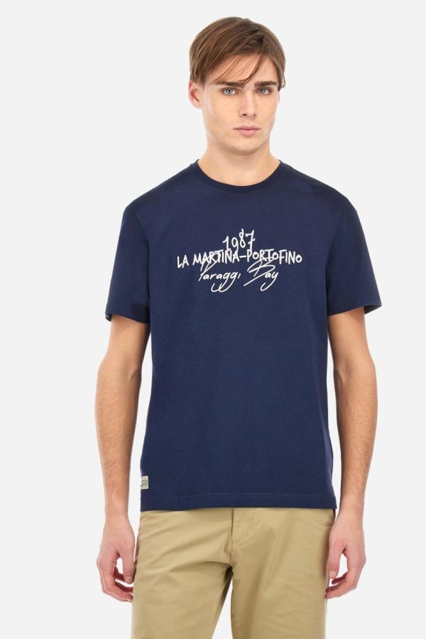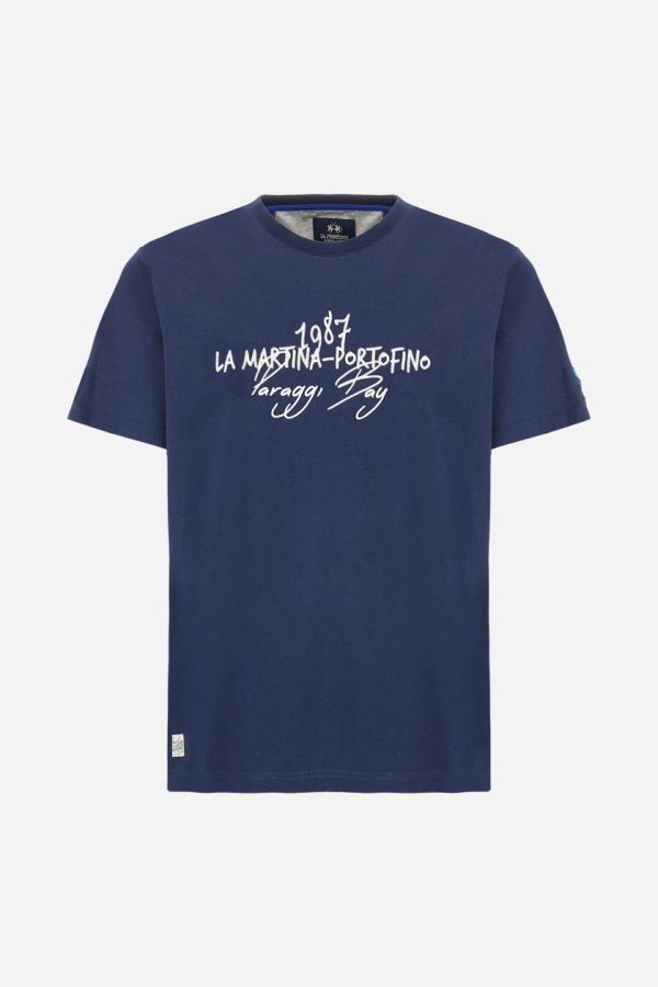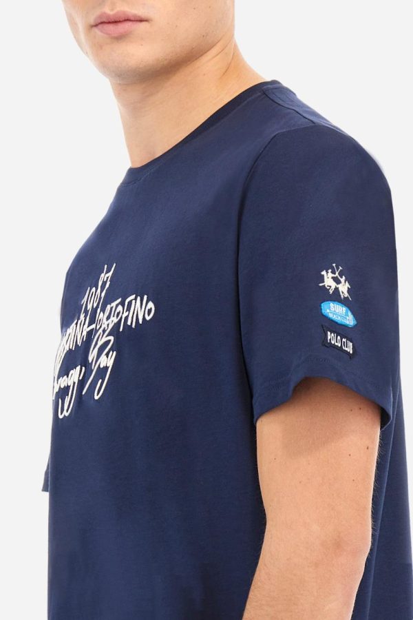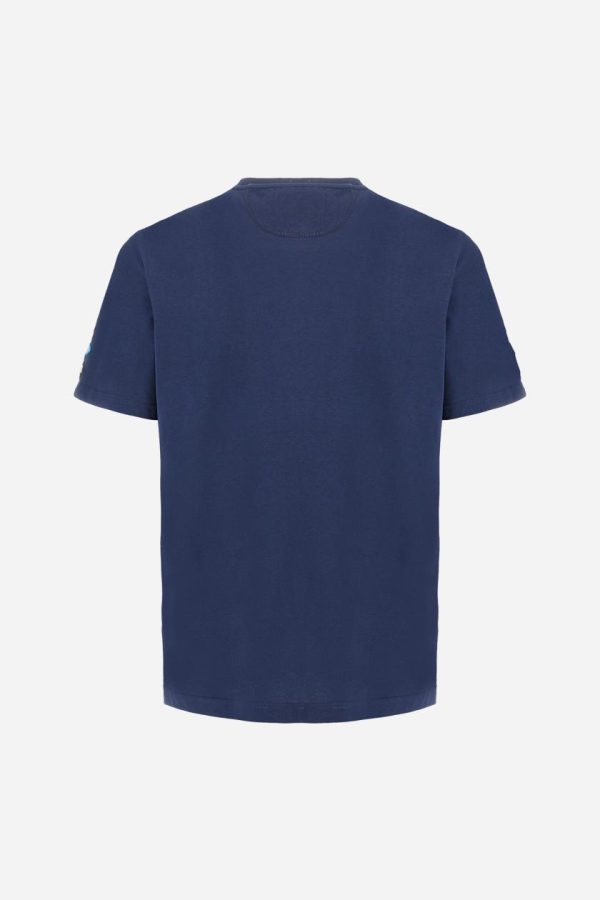 Men’s plain cotton jersey short-sleeved T-shirt. Crew neck with ribbed collar and crescent applied on the inside of the collar in jersey in a contrasting colour, like the ribbon sewn on the inside of the collar. On the chest, the graphics inspired by Portofino and its beaches are a mix of slightly raised rubberised print and embroidery with special stitches. On the left sleeve there are two small multicoloured patches in addition to the embroidered logo. The logo is embroidered on the left sleeve in a contrasting colour thread. Regular fit. The model is wearing a size L.
