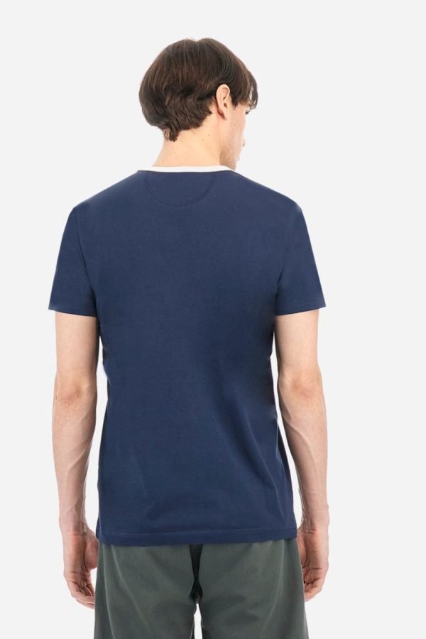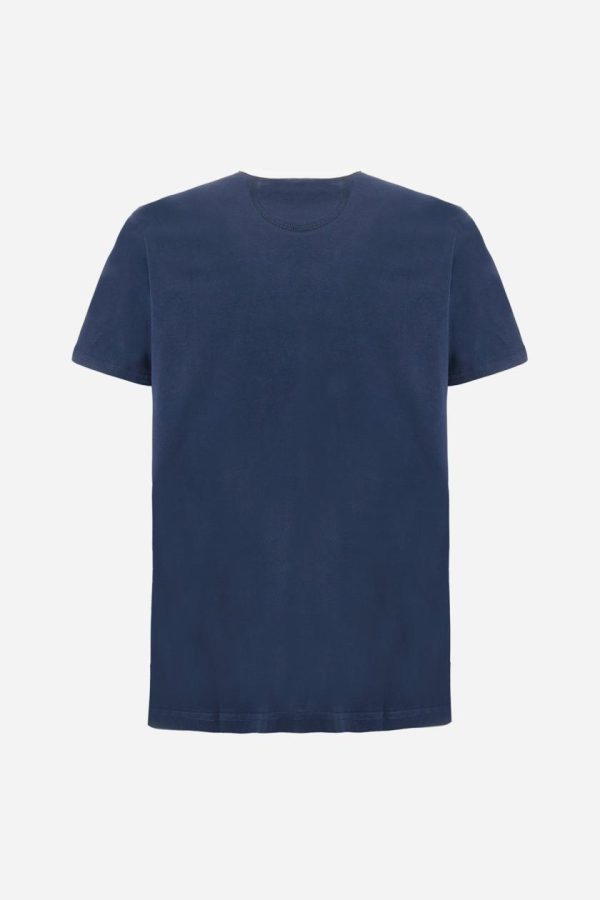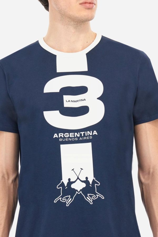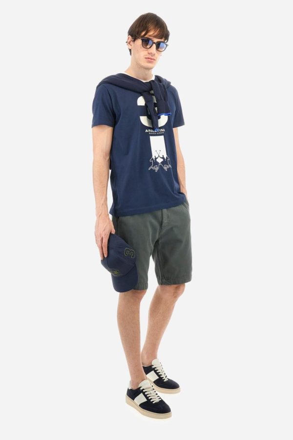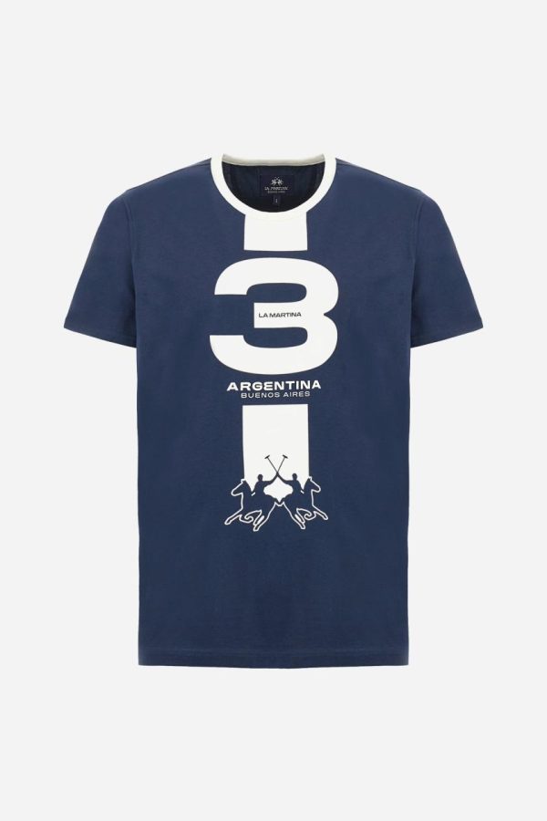 Men’s plain cotton jersey T-shirt. Contrasting ribbed crew neck. On the front, there is a large contrasting printed graphic. A large logo appears at the bottom of the central band. Regular fit. The model is wearing a size L.