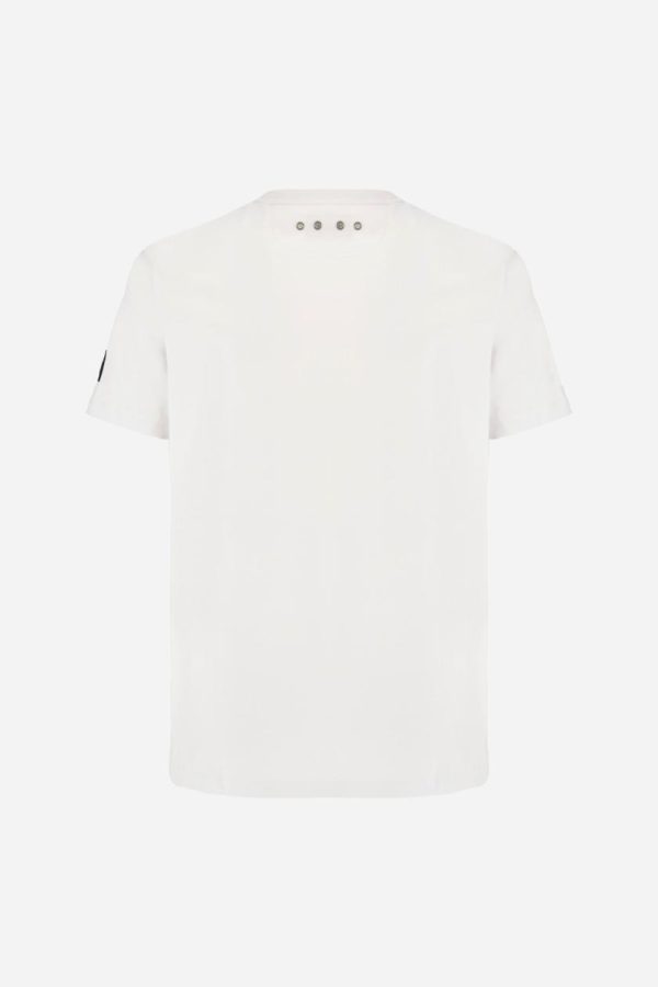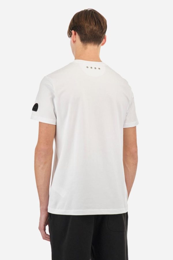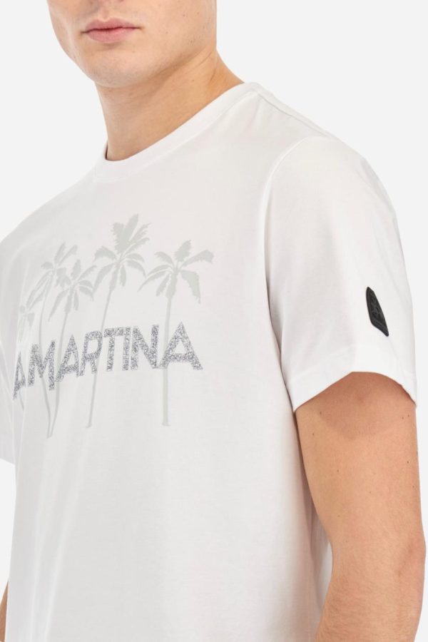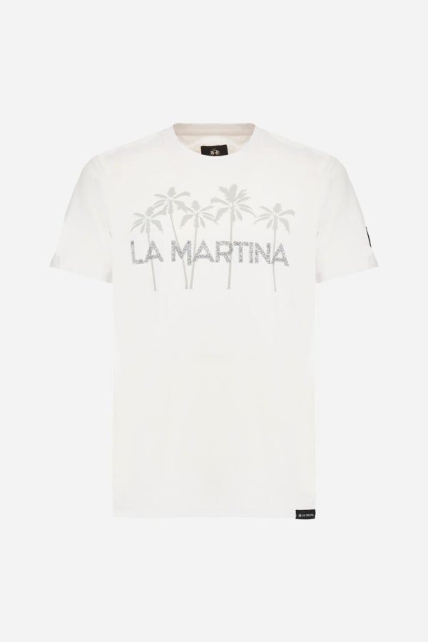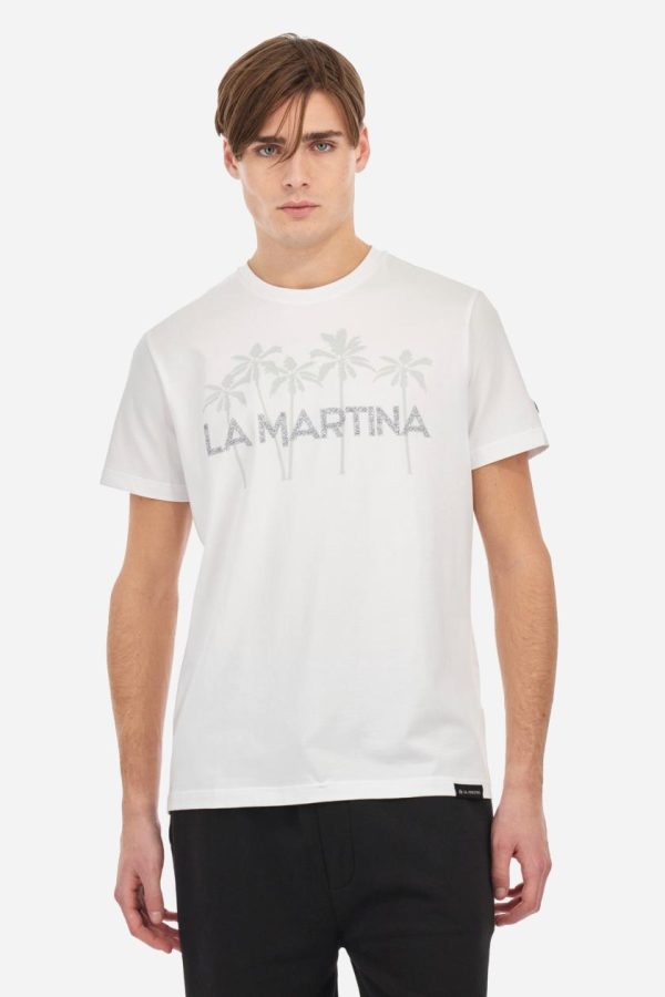 Short-sleeved men’s T-shirt in plain colour, made of cotton jersey with a silky feel. Crew neck with matching ribbed collar. The palm trees on the chest are a slightly translucent water print and are embellished with lurex thread embroidery of the La Martina lettering featuring special stitches. On the back, under the collar, the 4 personalised metal eyelets characterise the Jet Set capsule. The logo is depicted on the rubberised patch applied on the left sleeve. Regular fit. The model is wearing a size L.