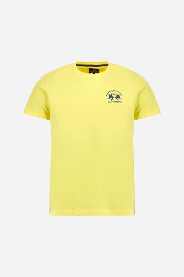 Men’s plain short-sleeved T-shirt, made from 100% cotton. Large logo embroidered on the front. Regular fit. The model is wearing a size L.