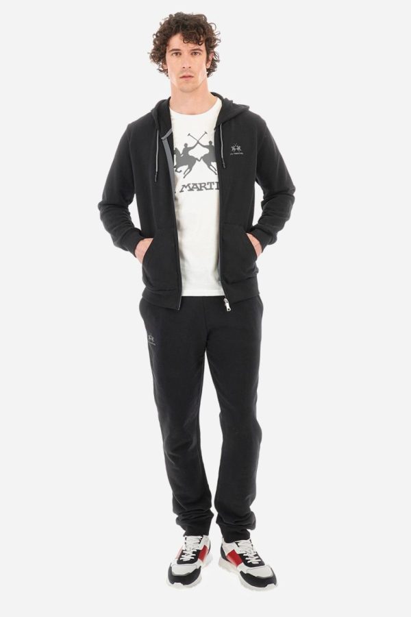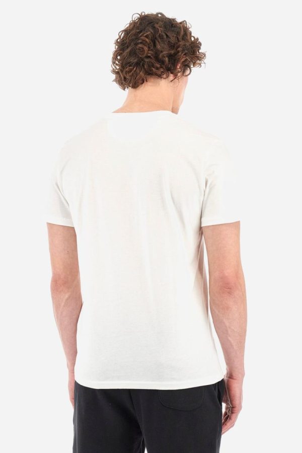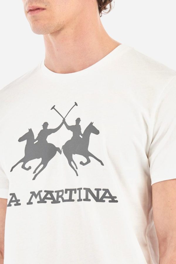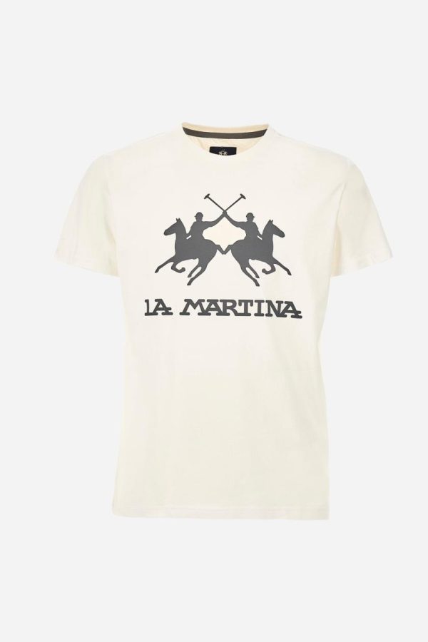 Men’s short-sleeved T-shirt with crew neck and solid colour. It features a large printed logo on the front and is made of 100% cotton with a regular fit. It can be combined with trousers for a casual and modern look. The model is 187 cm tall and wears a size L.